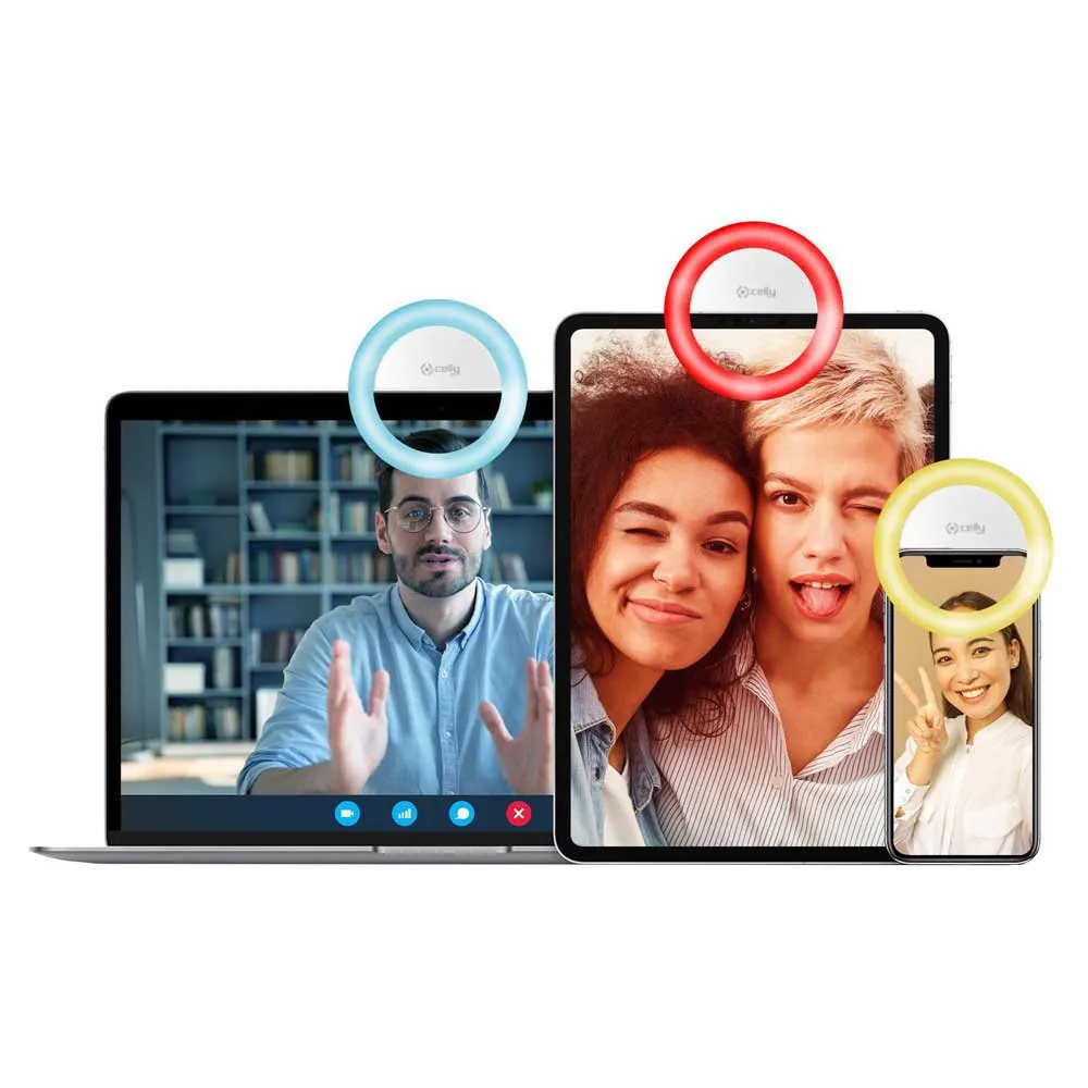 The indispensable tool for creating perfect social content! CLICKLIGHTRGB is a pocket and universal selfie light with RGB lights, with an opening clamp up to 1.7 cm wide, allowing it to adapt to all smartphones and to any tablet or laptop.CLICKLIGHTRGB offers 3 levels of light intensity, different color possibilities thanks to the integrated RGB lights,including white, blue, yellow, red and green, and multiple dynamic light modes.With just 8.5cm in size, this selfie light is compact, lightweight and portable: you can easily carry it with you in your bag or backpack.When out of battery, CLICKLIGHTRGB is easily rechargeable: just connect it to a charger via its Micro Usb cable (included in the package).Compatibile with different models of Smartphone: Apple , Samsung , Motorola , Xiaomi, OPPO , Huawei , TCL , Alcatel . Vivo , Realme, Honor.