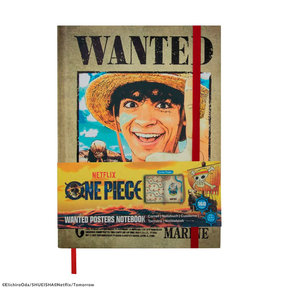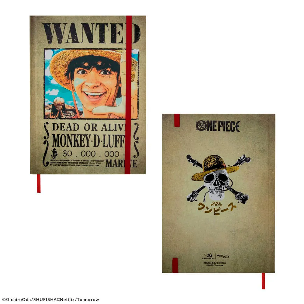 A hardcover notebook featuring the famous ´´Wanted Posters´´ from One Piece, ideal for fans of the show who want to keep track of their own adventures.