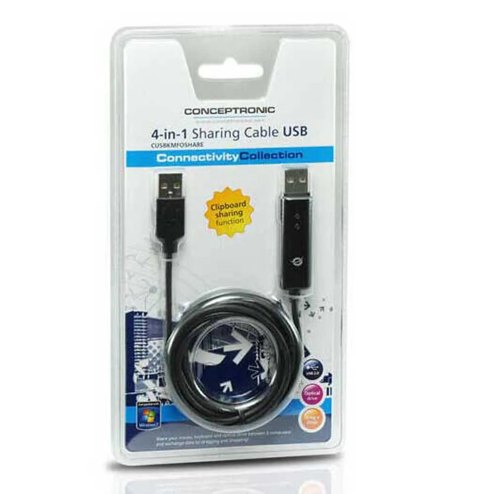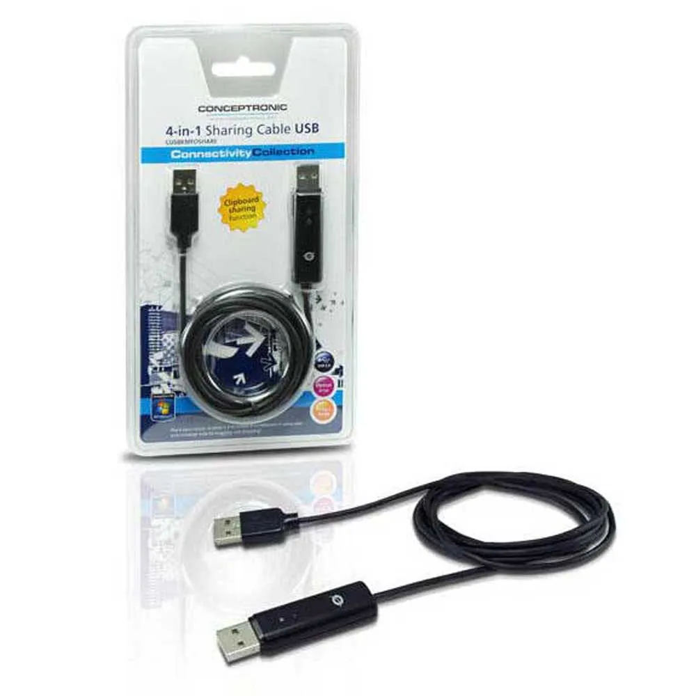 If you like to use 2 computers simultaneously but you only want to use 1 keyboard and 1 mouse doing this, the Conceptronic 4-in-1 Sharing Cable USB is your solution! Besides sharing your keyboard and mouse you can easily share documents, your optical drive and/or copy data by dragging and dropping them from one computer to the other.