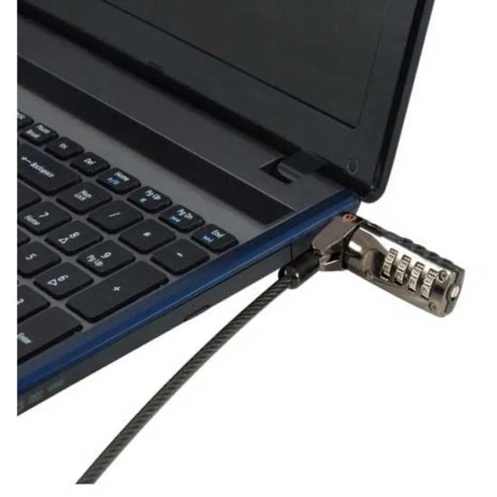 The Combination Laptop Lock secures laptop against theft*. The lock fits on every notebook with a security connection. Simply secure the 1.8 meters cable to a fixed object (e.g. in a library, airport or office) and connect it to the laptop. Thanks to the combination lock you don’t have to be afraid that your keys get lost.