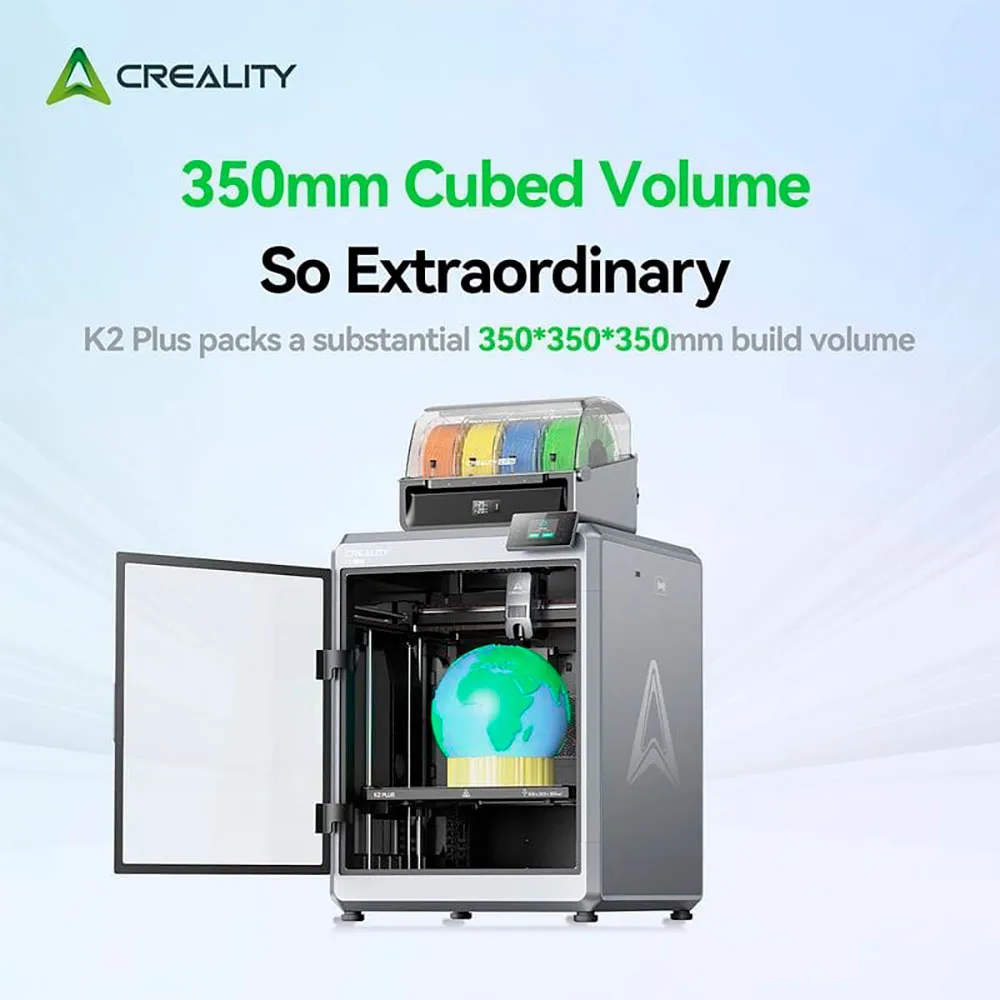The K2 Plus printer offers a build volume of 350x350 x 350 mm, allowing you to print all kinds of objects at high speed, reaching 600 mm/s.