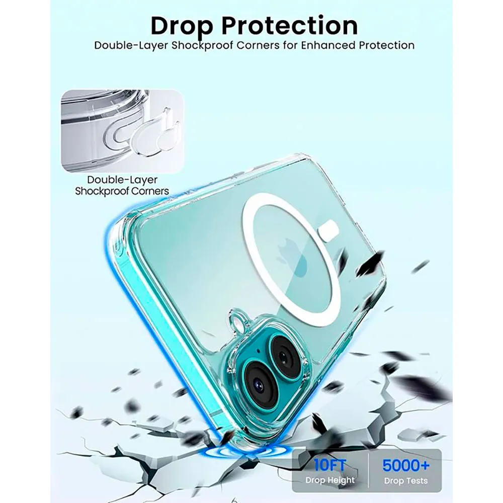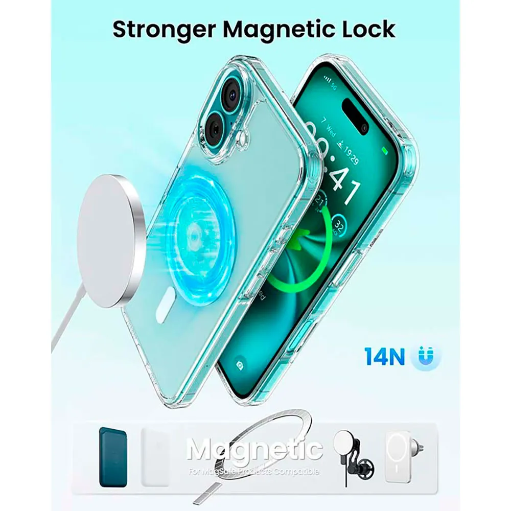This transparent case for the iPhone 16 mobile phone includes a magnet compatible with Magsafe charging, as well as any magnetic car mount.