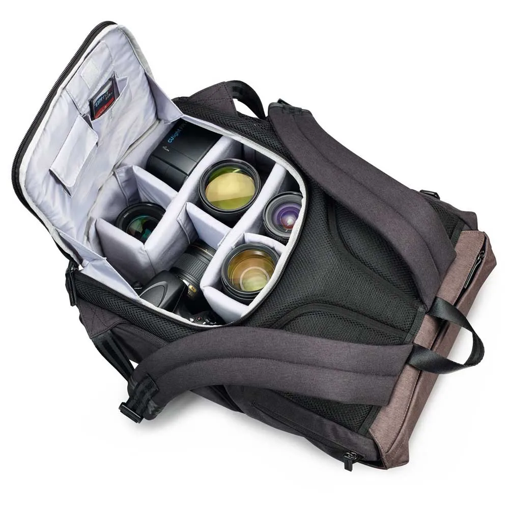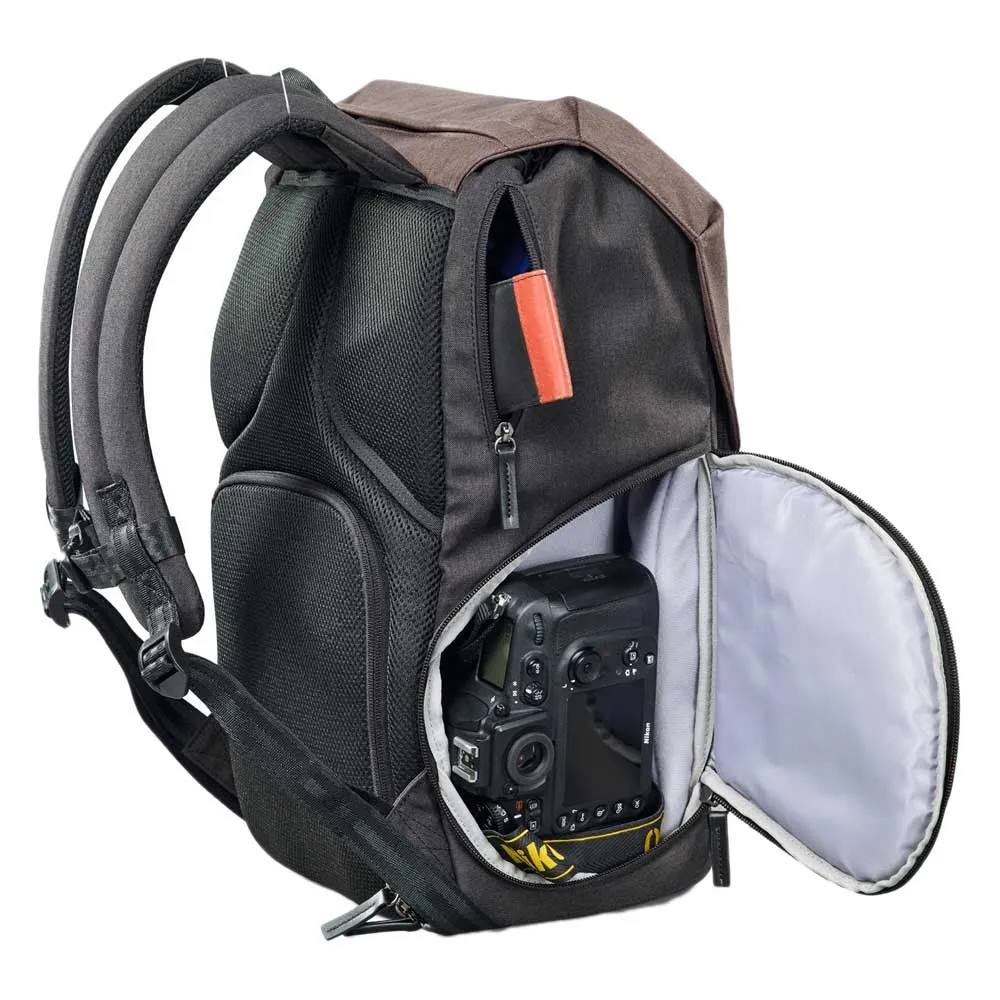 The Bristol Daypack 600+ is intelligently divided into two main compartments. The lower section houses the removable camera bag, providing cushioned and secure storage for your DSLR or mirrorless camera with a lens attached, plus additional lenses, a flash, or other sensitive accessories. The spacious upper compartment is perfect for your personal belongings. It features a unique "doctor´s bag" style opening that provides a wide, clear view of the contents, making it incredibly easy to pack and access items like a jacket, snacks, a drone, or travel guides.