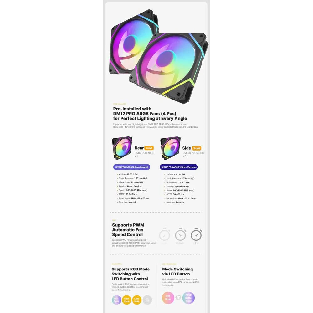 * Exceptional Cooling Potential: Achieve peak performance with massive cooling capacity. The DY570 supports a top-mounted 360 mm liquid cooling radiator for maximum CPU thermal control. With versatile fan mounts throughout the chassis, you can install up to nine fans, including multiple 140 mm fans on the top and side for high-airflow, low-noise operation.