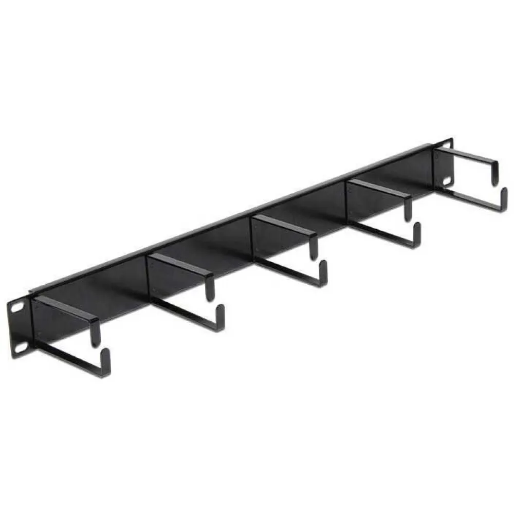 This Delock cable management panel can be mountedin a 19? rack. With the solid metal D-ring hooks, the patch cables can be routed in an orderly manner. horizontally .