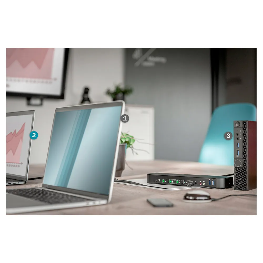 * Centralized Peripheral Sharing:The built-in USB 3.0 hub allows you to share high-speed devices between both connected computers, saving costs and desk space.