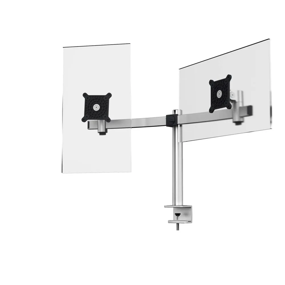 - Monitor holder consists of desk column, cross brace and two sliding, rotating VESA mounts for monitors