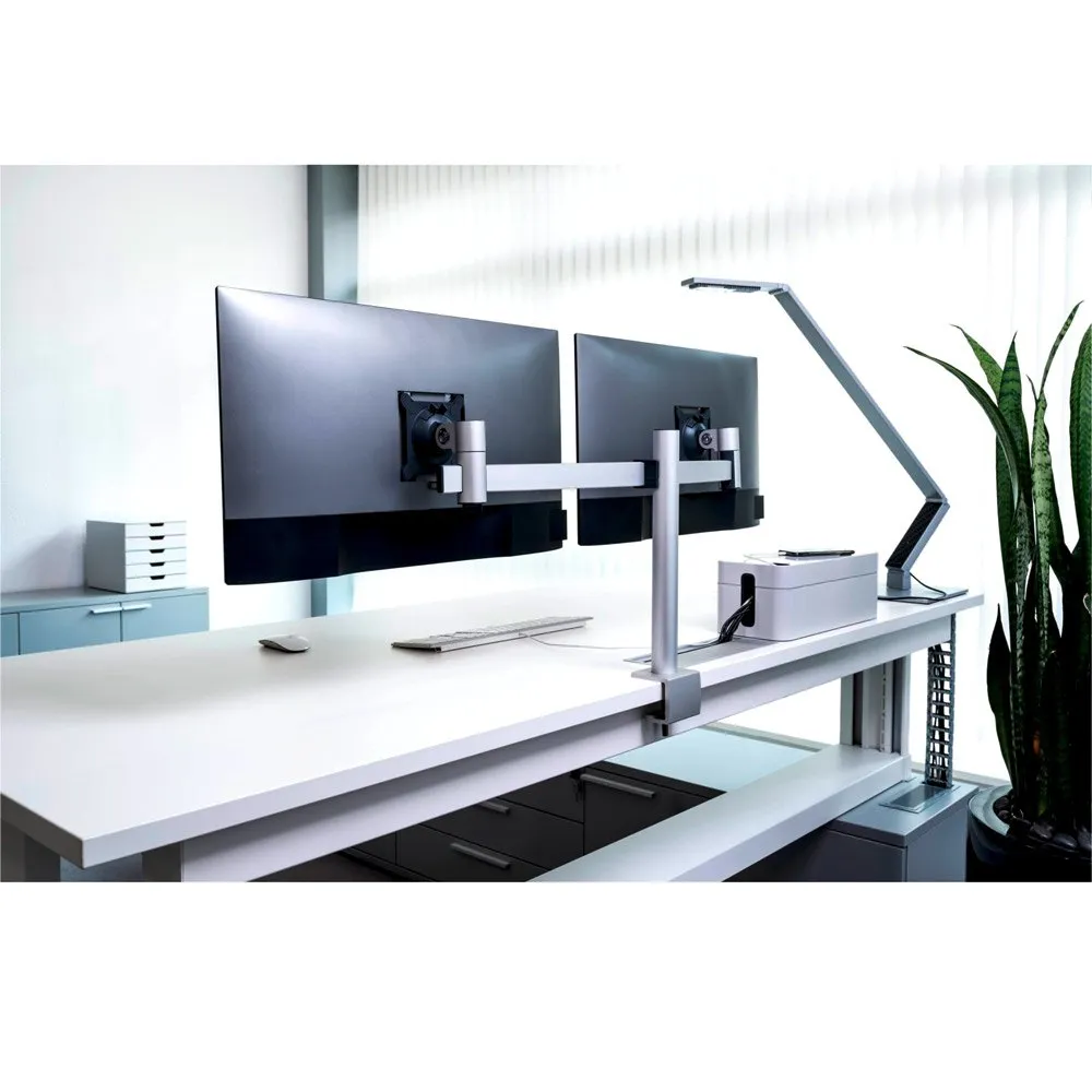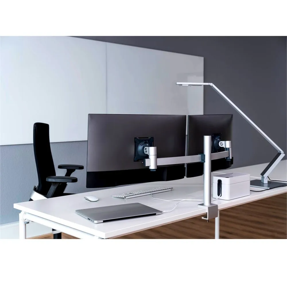 Whether at work or at home, most people spend a lot of time in front of a computer screen. Health and well-being therefore play an important role at the desk. The monitor double mount from DURABLE supports particularly efficient work at an ergonomic workplace.