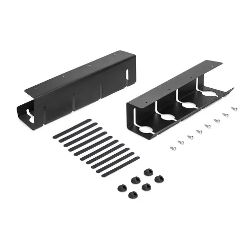 The tray includes the necessary screws for installation and small adhesive cable organizers.