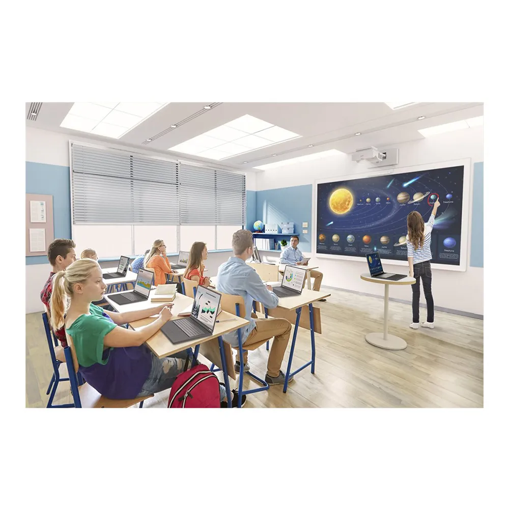 Elevate your presentations with the Epson EB-760Wi interactive projector. Its powerful 4.100-lumen laser source and 3LCD technology project a stunning, glare-free WXGA image up to 100”. The ultra-short-throw lens eliminates shadows, allowing you to engage directly with your content. Collaborate in real-time using dual interactive pens for on-screen annotations. Effortlessly share from PCs or mobile devices with versatile wireless options, including Miracast™ screen mirroring. A dynamic, eye-safe alternative to traditional flat panels for any classroom or meeting room