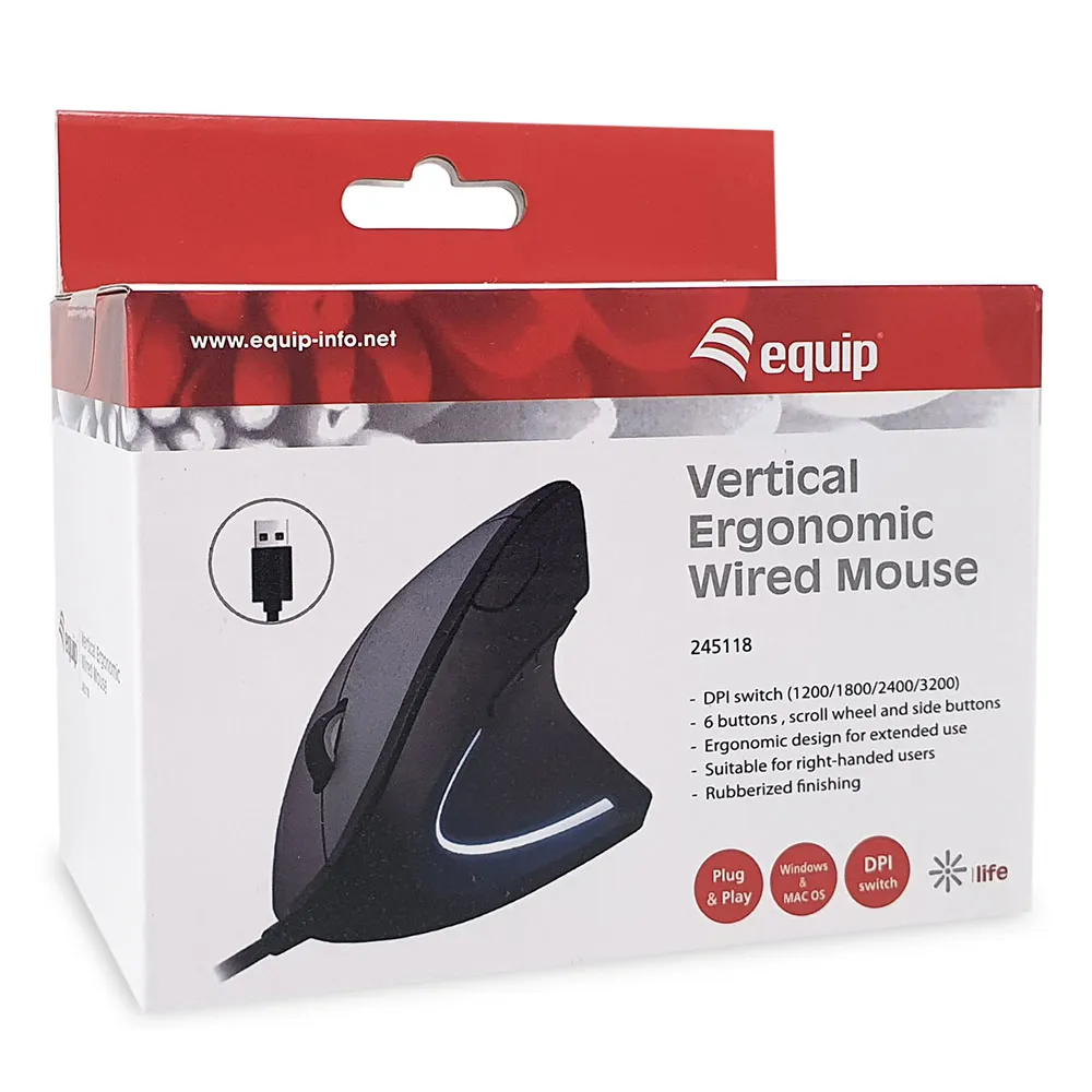 The Equip 245118 Vertical Ergonomic Wired Mouse is designed to provide optimal comfort and support for your hand, wrist, and forearm, making it an ideal choice for long hours of computer use.