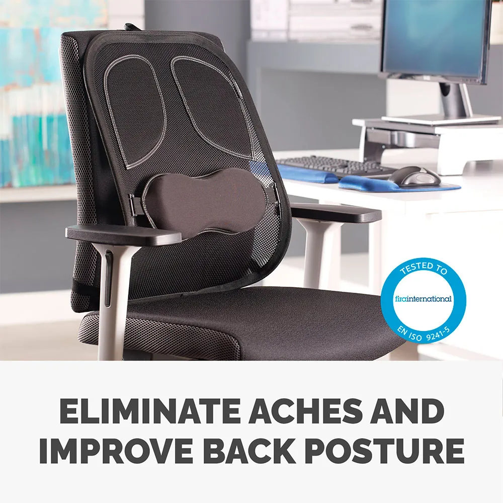 Transform your workday comfort and enhance your well-being with the FELLOWES Professional Mesh Back Support. Designed for individuals who spend extended hours seated, this ergonomic accessory is the ultimate upgrade for any office chair, providing targeted relief and promoting a healthier posture. Say goodbye to the discomfort and strain associated with poor spinal alignment and embrace a new standard of supportive seating.