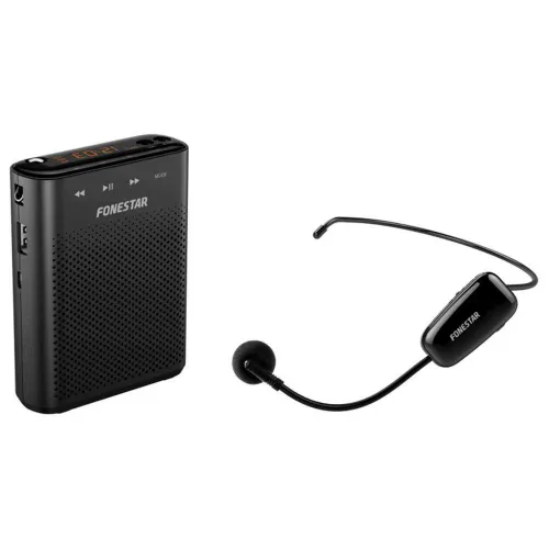 USB/microSD/MP3 portable amplifier FEATURES Be heard clearly from a distance without distortion and without the need to strain your voice. Wireless microphone allows you to move freely. Simple to use due to its compact size and user-friendly controls. Sturdy and robust, for everyday use. Manufactured in ABS. Ergonomic design with built-in attachment clip, waist strap and carrying case ensures comfortable use for extended periods of time. The long-lasting rechargeable battery is perfect for a long day´s work. The MP3 music player and voice recorder make lectures and chats more enjoyable. APPLICATIONS For teachers, trainers, speakers, tour guides and coaches. TECHNICAL DATA UHF wireless microphone USB/MicroSD/MP3 recorder/player Battery life: 9 h average volume