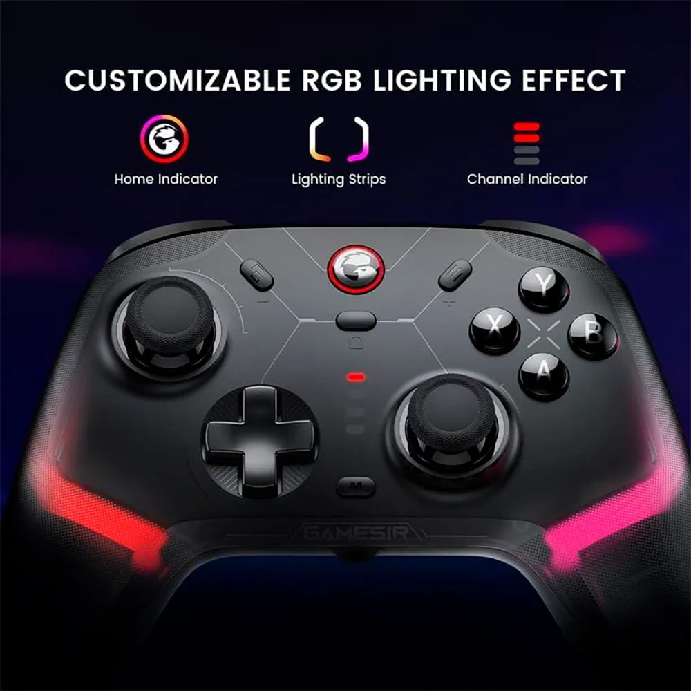 For different platforms - Bluetooth/cable/adapter - GameSir Mag-res TMR sticks - Triggers with two usage modes - Vibration motors - 6-axis gyroscope - RGB lighting - APP - 860 mAh battery - Black - RGB support.