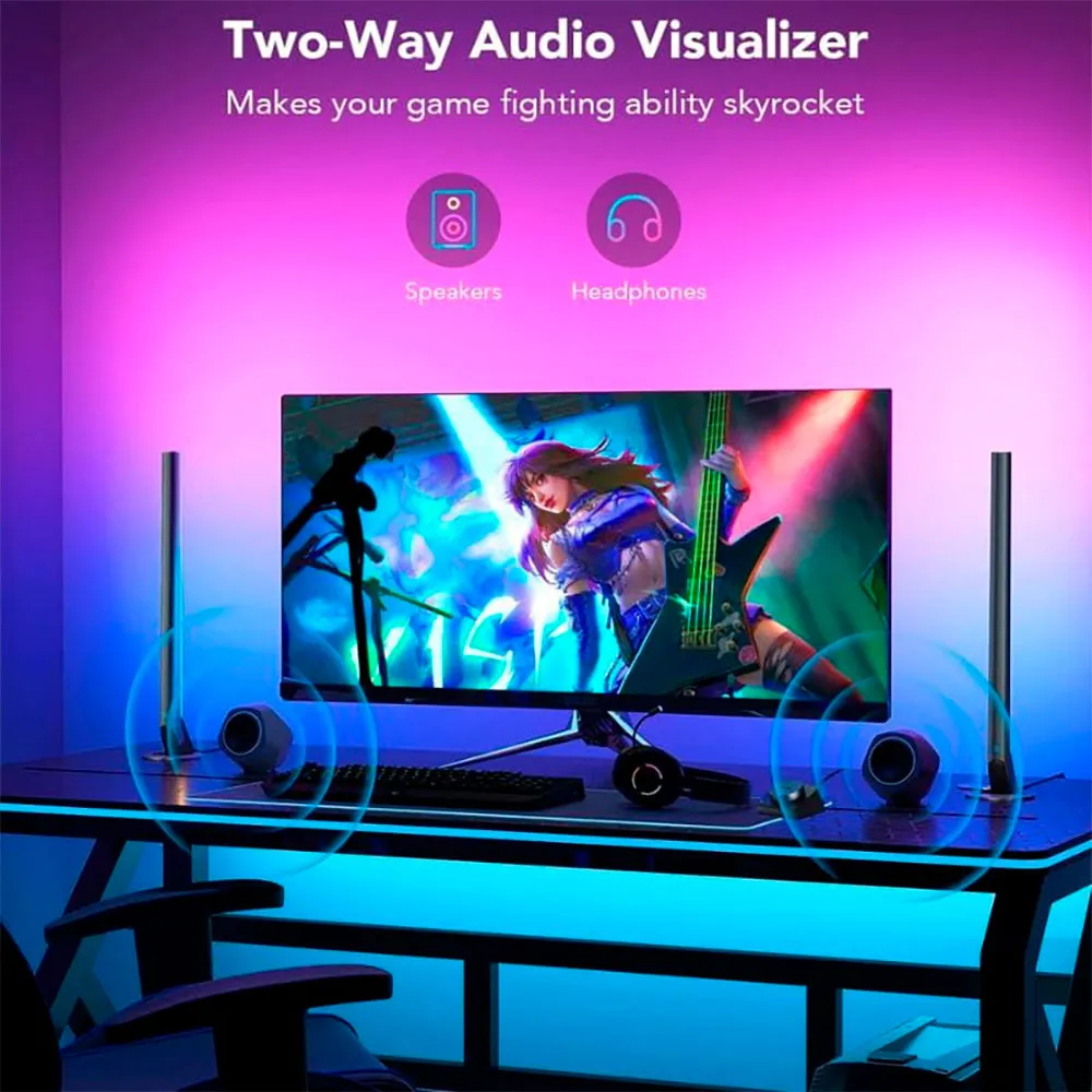 With multi-zone RGBIC technology that allows displaying multiple simultaneous colors, these bars create immersive environments thanks to their 41 LEDs with 215° curved optics and more than 60 pre-designed scenes.