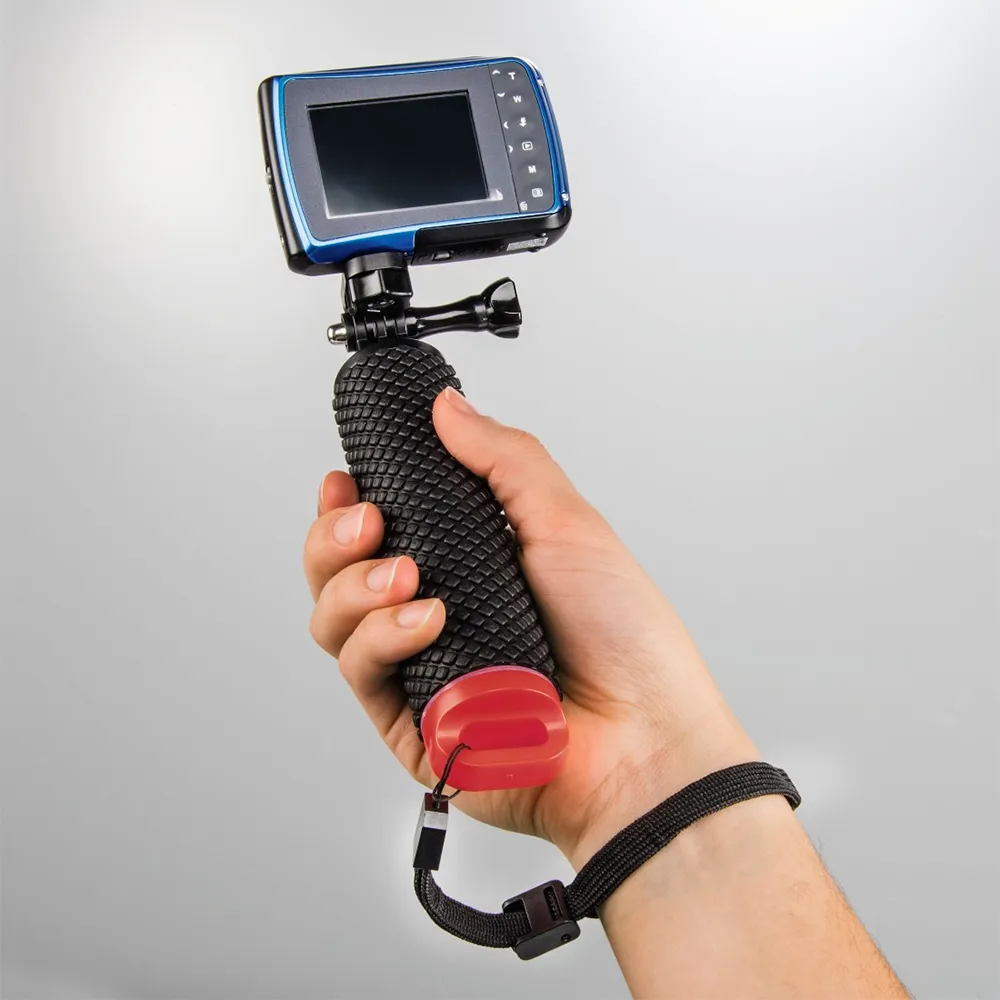 -Floaty grip for GoPro action cameras and underwater cameras with a hand strap for stabilized filming in and under water.