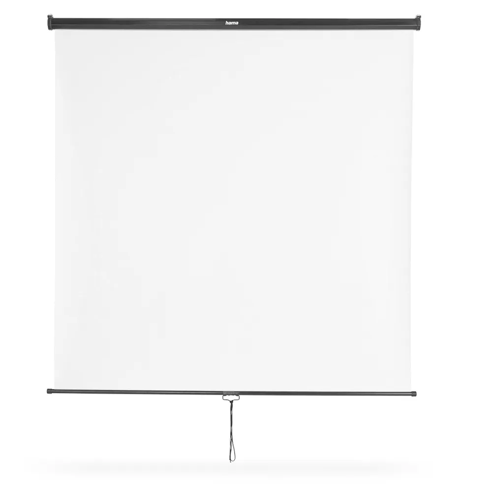 --- Technical Specifications:* Product:HAMA 21576 Projection Screen * Attribute:Screens * Type:Manual Pull-Down * Mounting:Wall or Ceiling Mountable * Format:1:1 * Projection Diagonal:255 cm (100 inches) * Visible Projection Surface (W x H):180x180 cm * Screen Fabric Quality:M1 (PVC) * Gain Factor:1.0 * Viewing Angle:150° * Housing Dimensions (W x D x H):192x7 x 7 cm * Weight:6.5 kg * Projection Type:Front Projection * Special Feature:Light-proof black back, Cleanable surface.
