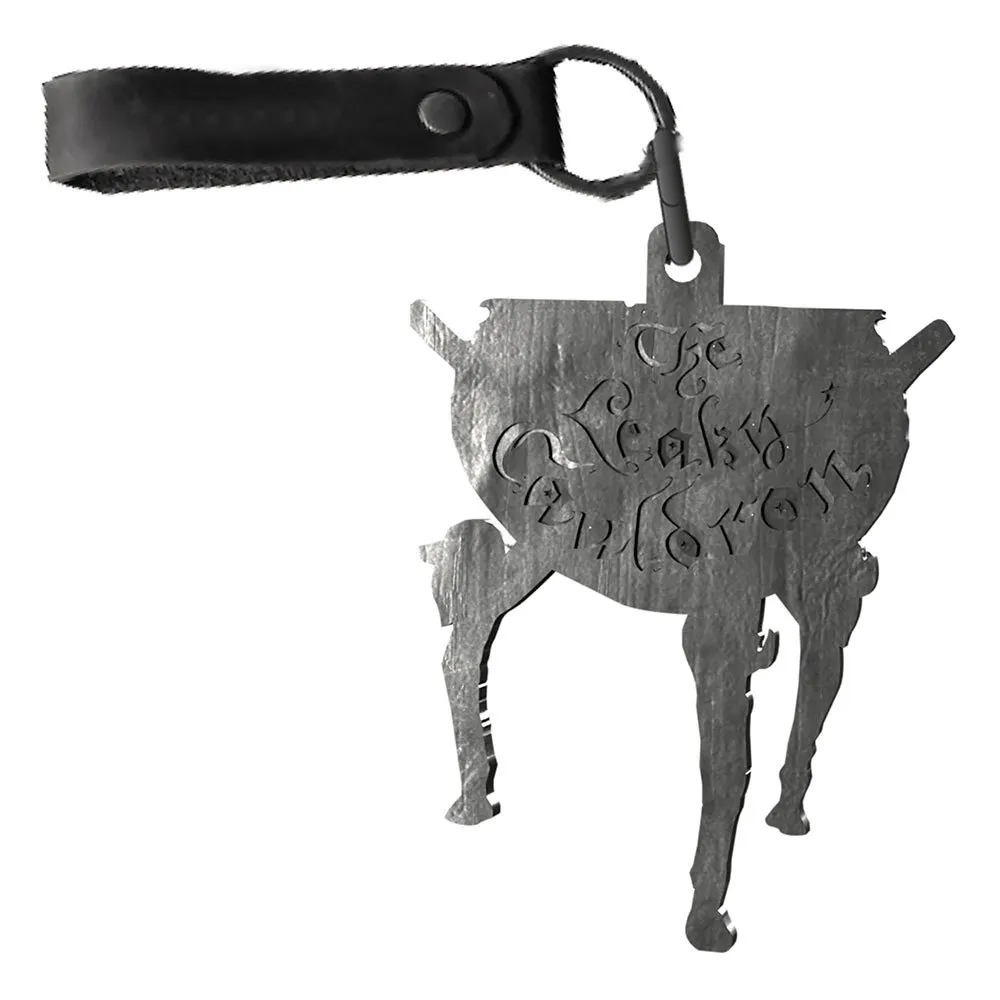 metal keyring with leather strap with the emblematic leaky cauldron design.