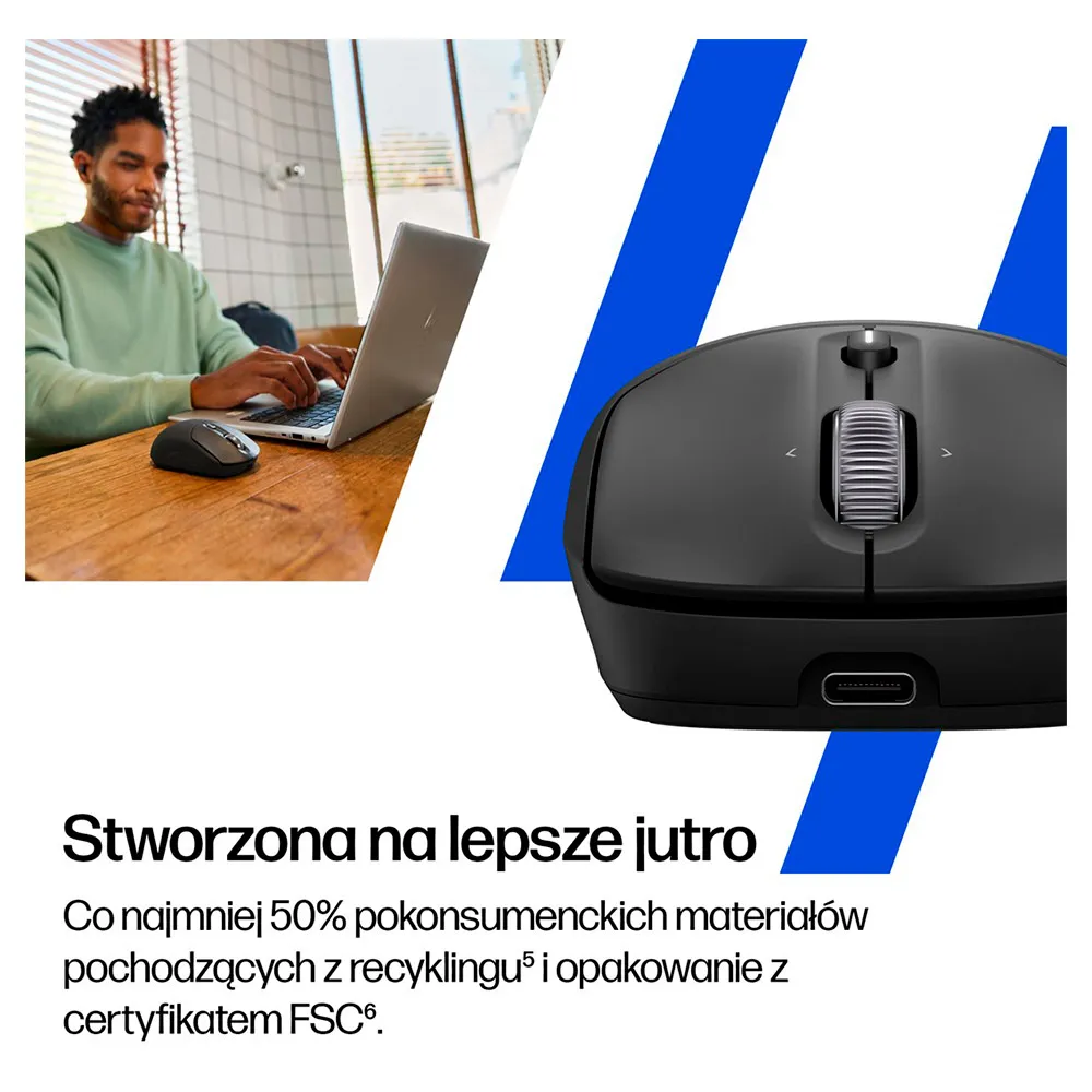 The HP Rechargeable Wireless Mouse, is made with at least 50% post-consumer recycled materials.