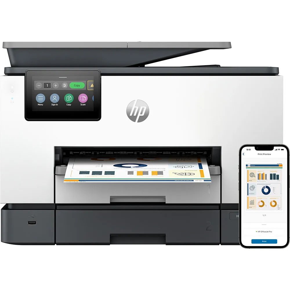 HP Officejet Pro 9130b:Manage printing like a pro The HP Officejet Pro 9130b is a professional color inkjet printer designed for offices and hybrid workforces.