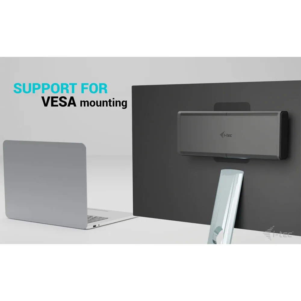 The dock can be installed behind the monitor (if it supports a standard VESA mount), using the i-tec VESA mount.