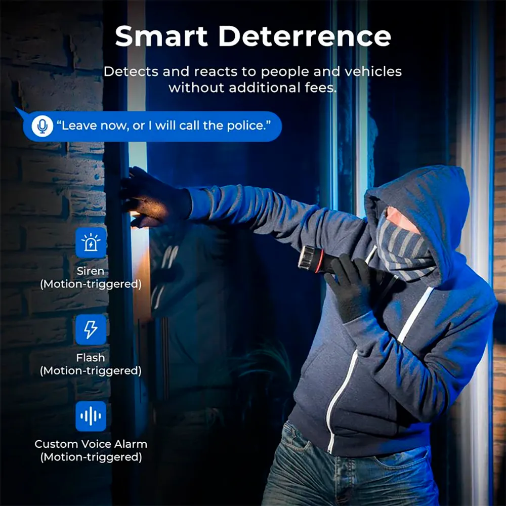It incorporates a siren and LED flash lights to scare away threats, with the possibility of using the built-in microphone and speaker system so they can hear your voice.