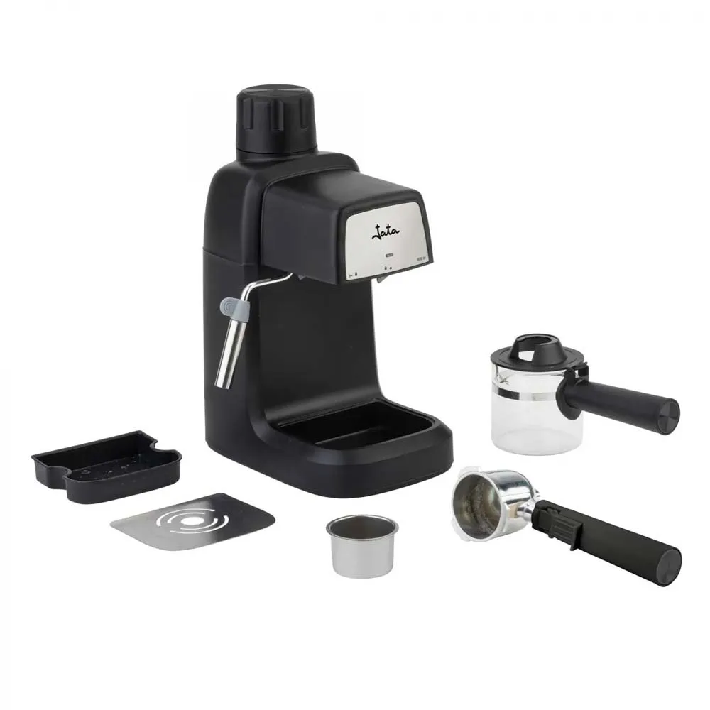 Technical Specifications:* Model:JATA JECA2201 * Product Type:Espresso Coffee Maker * Pressure Pump:20 bar * Heating System:Thermoblock (Rapid Heating) * Power:850 W * Voltage:230 V * Water Tank Capacity:1.2 Litres (Removable) * Functions:Espresso (1 or 2 cups), Steam, Hot Water * Filter Holder:Metal with filters for 1 and 2 coffees * Drip Tray:Removable for easy cleaning * Safety:Protection system against overheating and overpressure * Controls:Illuminated control dials * Included Accessories:Measuring spoon with tamper.