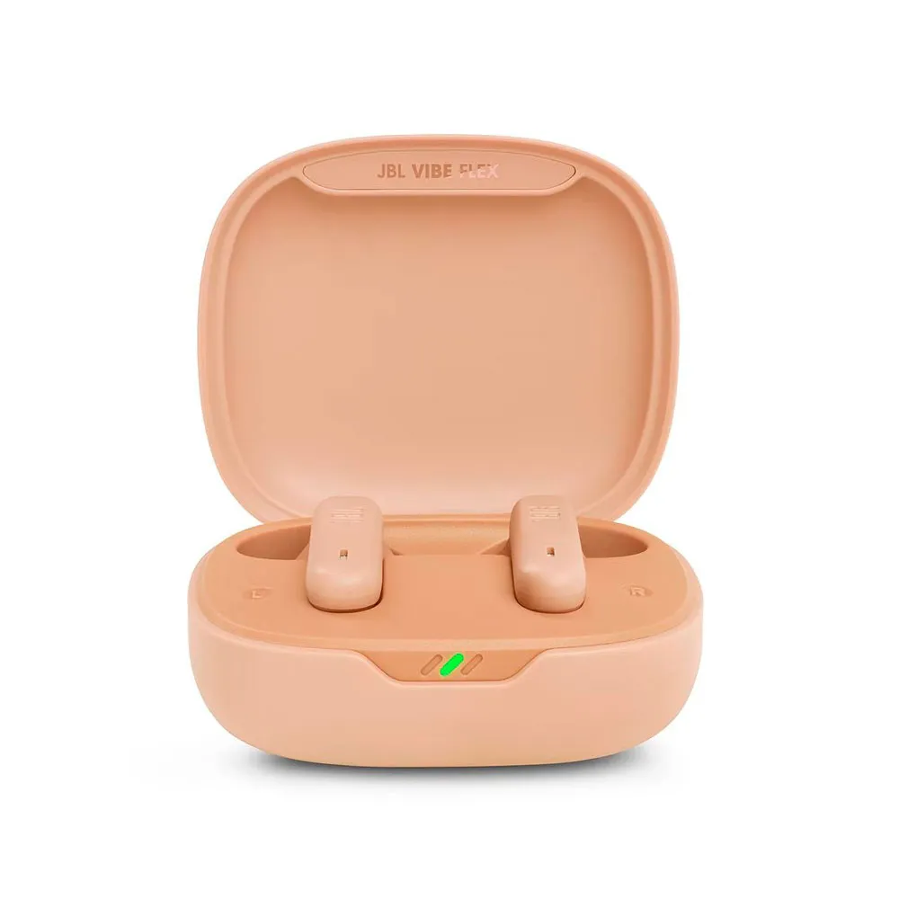 JBL Vibe Flex True Wireless InEar Headphones in beige with built-in microphone, Bluetooth 5.2 connectivity, case with up to 32h of battery life / 2h of charging with USB-C connector What do we highlight? True Wireless InEar Headphones Built-in microphone Bluetooth 5.2 connectivity Case with up to 32h of battery life / 2h of charging with USB-C connector JBL Vibe Flex Simple, smart and fun every day! Take your sound everywhere.