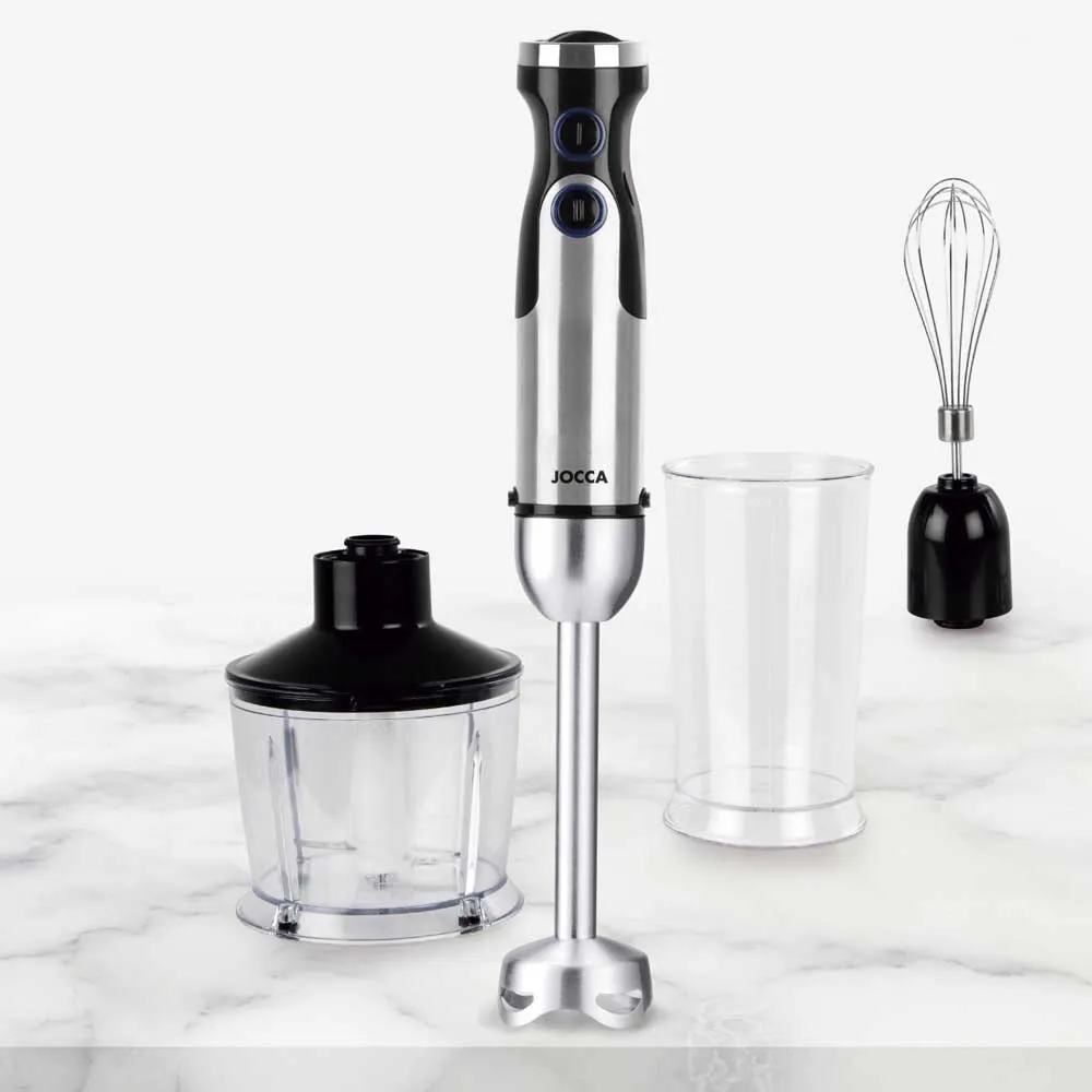 With the Jocca hand mixer you can blend, chop and crush all kinds of food in less time thanks to its 1200W power and its accessories, which include a measuring cup, whisks and a chopper.