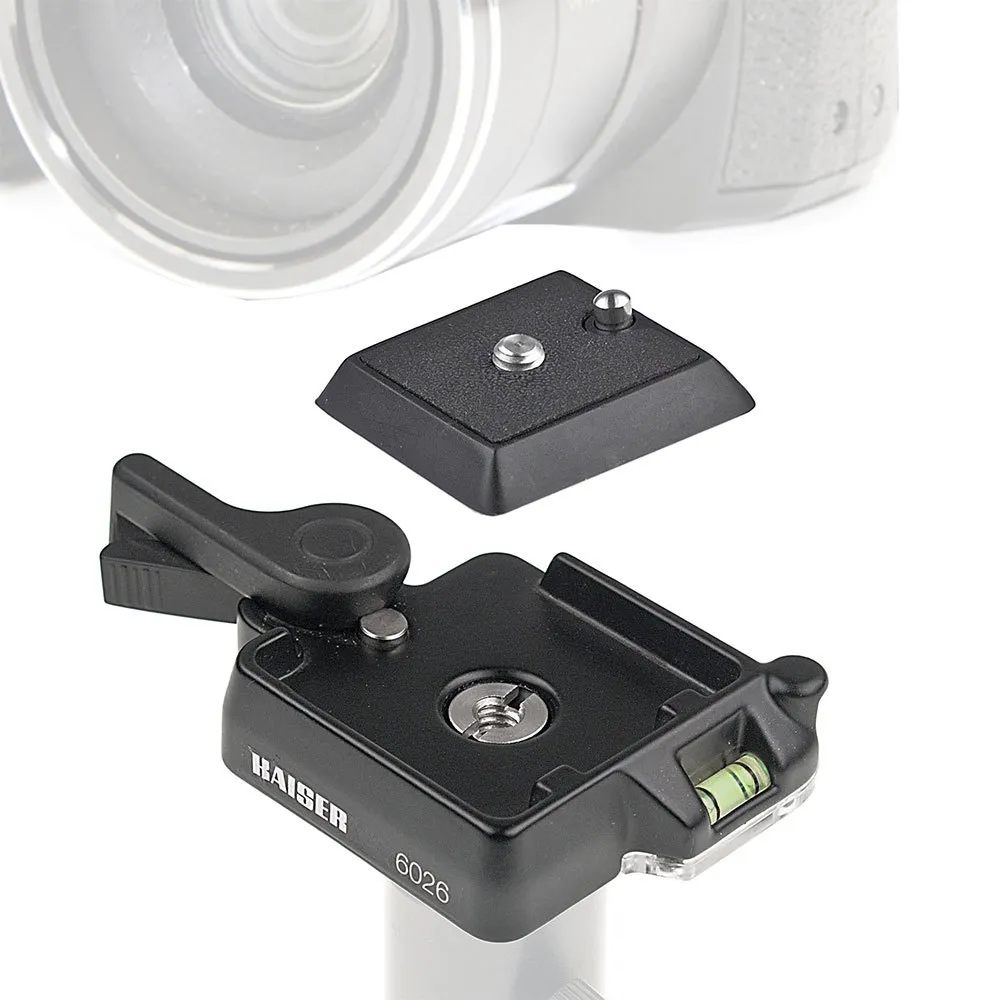 For quick mounting of camera on tripod. The upper part is mounted on the camera’s tripod bush and stays there, the lower part is attached to the tripod. Release lever with additional safety lock, three spirit levels for precise positioning, 3/8´´ tripod thread with 1/4´´ thread adapter.