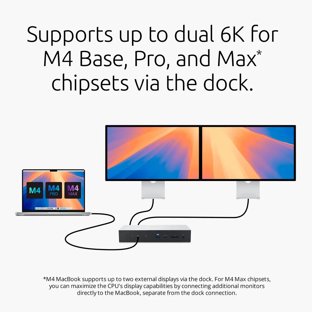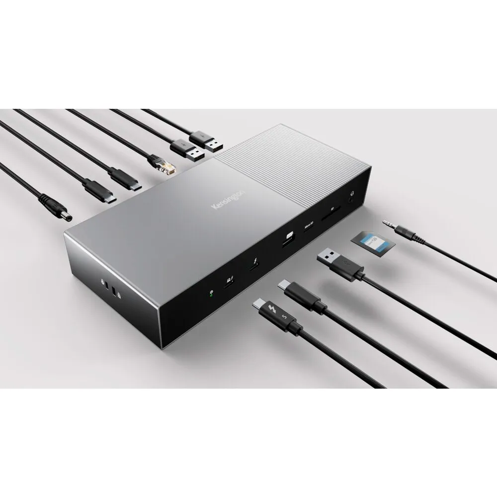 Professionals with premium laptops often struggle to unlock the full potential of their devices For those wanting to connect multiple high-resolution displays, transfer data at high speeds, and expand connectivity without relying on adapters, the SD5000T5 Thunderbolt™ 5 Triple Video Docking Station is the ultimate powerhouse Providing a powerful single-cable solution that helps you be more productive, it supports multiple 4K monitors for expanded visual productivity, turbocharged speeds for working with large files, more ports for connecting accessories without using adapters, and amplified charging for meeting the demands of high-power workstations Boost Your Productivity with Thunderbolt™ 5 The SD5000T5 offers lightning-fast data transfers, achieving speeds up to 80Gbps and Bandwidth Boost providing up to 120Gbps for video-intensive usage Recycled Materials Contains 100% post-consumer recycled (PCR) aluminum*- and delivered in Forest Stewardship Council (FSC®) certified packaging * The outer casing of the docking station is made of aluminium, excluding the PCBA and any related inner components Triple 4K or Dual 8K Support Supporting up to three 4K monitors at 144Hz or two 8K monitors at 60Hz, MacBook models with M4 Base, or M1/M2/M3/M4 Pro and Max, support up to two 6K monitors at 60Hz The SD5000T5 ensures uncompromised visual quality and smooth multitasking for a high-performance workspace Up to 140W Power Delivery Perfect for demanding workstations, the single-cable Thunderbolt™ 5 solution ensures seamless power and connectivity with up to 140W Power Delivery Productive 11-in-1 Design 3 x Thunderbolt™ 5 downstream ports, 1 x Thunderbolt™ 5 host, 3 x USB-A 3.2 Gen2 10Gbps ports, a combo audio jack, dual SD/Micro Card readers, and 2.5Gbps Ethernet for seamless productivity Built-in SD and Micro SD Card Readers Perfect for graphic designers, video editors, and animators requiring fast and efficient data transfer speeds, the SD5000T5 transfers files at ultra-fast speeds via built in UHS-II SD and Micro SD card readers Universal Compatibility Offers a quick and powerful plug-and-play solution for Thunderbolt™ 5, Thunderbolt™ 4, USB4®, and USB-C® devices running Windows 11 (23H2 or later) or macOS (14.5 or later) Zero-Footprint Mounting Option and Security Cable Lock Slots Maximize desktop space by mounting your docking station out of the way Protect your investment with a Kensington cable lock (K65020EU or K65021WW), sold separately Kensington SD5000T5 EQ Thunderbolt 5 Triple 4K Docking Station with 140W PD - Windows/macOS Connectivity technology:Wired, Host interface:Thunderbolt 5, USB Power Delivery up to:140 W Ethernet LAN data rates:10,100,1000,2500 Mbit/s Product colour:Black, Grey, Compatible memory cards:MicroSD (TransFlash), SD, HD type:8K Ultra HD AC input voltage:100 - 240 V, Input current:2.5 A, Output voltage:20 V Windows operating systems supported:Windows 11, Windows 11 Enterprise, Windows 11 Enterprise x64, Windows 11 Home, Windows 11 Pro, ., Mac operating systems supported:Mac OS X 15.0 Sequoia Boost productivity with speeds up to 80Gbps, with Bandwidth Boost providing up to 120Gbps for video-intensive usage Contains 100% post-consumer recycled (PCR) aluminum*- and delivered in Forest Stewardship Council (FSC®) certified packaging * The outer casing of the docking station is made of aluminium, excluding the PCBA and any related inner components Supporting up to three 4K monitors at 144Hz or two 8K monitors at 60Hz, MacBook models with M4 Base, or M1/M2/M3/M4 Pro and Max, support up to two 6K monitors at 60Hz Delivers up to 140W Power Delivery to meet the demands of high-power workstations Productive 11-in-1 design provides increased efficiency and seamless connectivity to various setups Built-in SD and Micro SD card readers provide ultra-fast file transfer options Plug-and-play solution for Thunderbolt™ 5, Thunderbolt™ 4, USB4®, and USB-C® devices running Windows 11 (23H2 or later) or macOS (14.5 or later) Zero-Footprint Mounting option to support a tidier workspace Offers security cable lock slots to support device protection Includes free Kensington DockWorks™ software to ensure the best connection, performance, and security from your Kensington dock For MacBook, the number of displays that can be connected through the dock is up to two external displays For M4 Max chipsets, you can maximize the CPU´s display capabilities by connecting additional monitors directly to the MacBook, separate from the dock connection