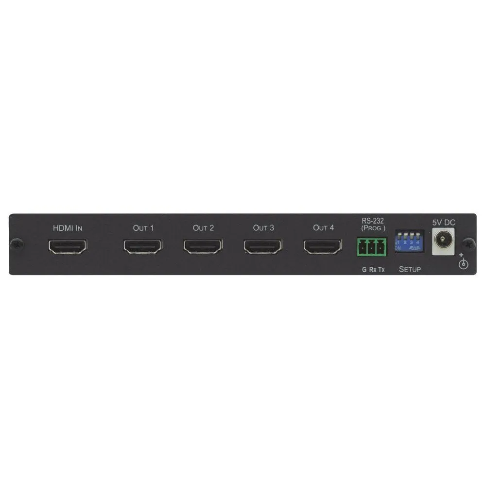 The unit equalizes and regenerates the input signal and distributes it to four identical outputs.