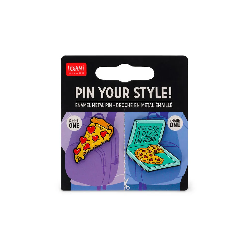 Transform your clothes and accessories into declarations of love, with Legami´s Pin Your Style. Pins. A pair of enamel metal pins made to go together are the perfect way to share your style with the one you love. Show off your style with the Pizza-themed Enamel Metal Pin. Pin it on to accessorise dresses, jackets, backpacks and much more, to make them (and you) stand out. Shiny, chrome-plated finish, bright colours and great durability.