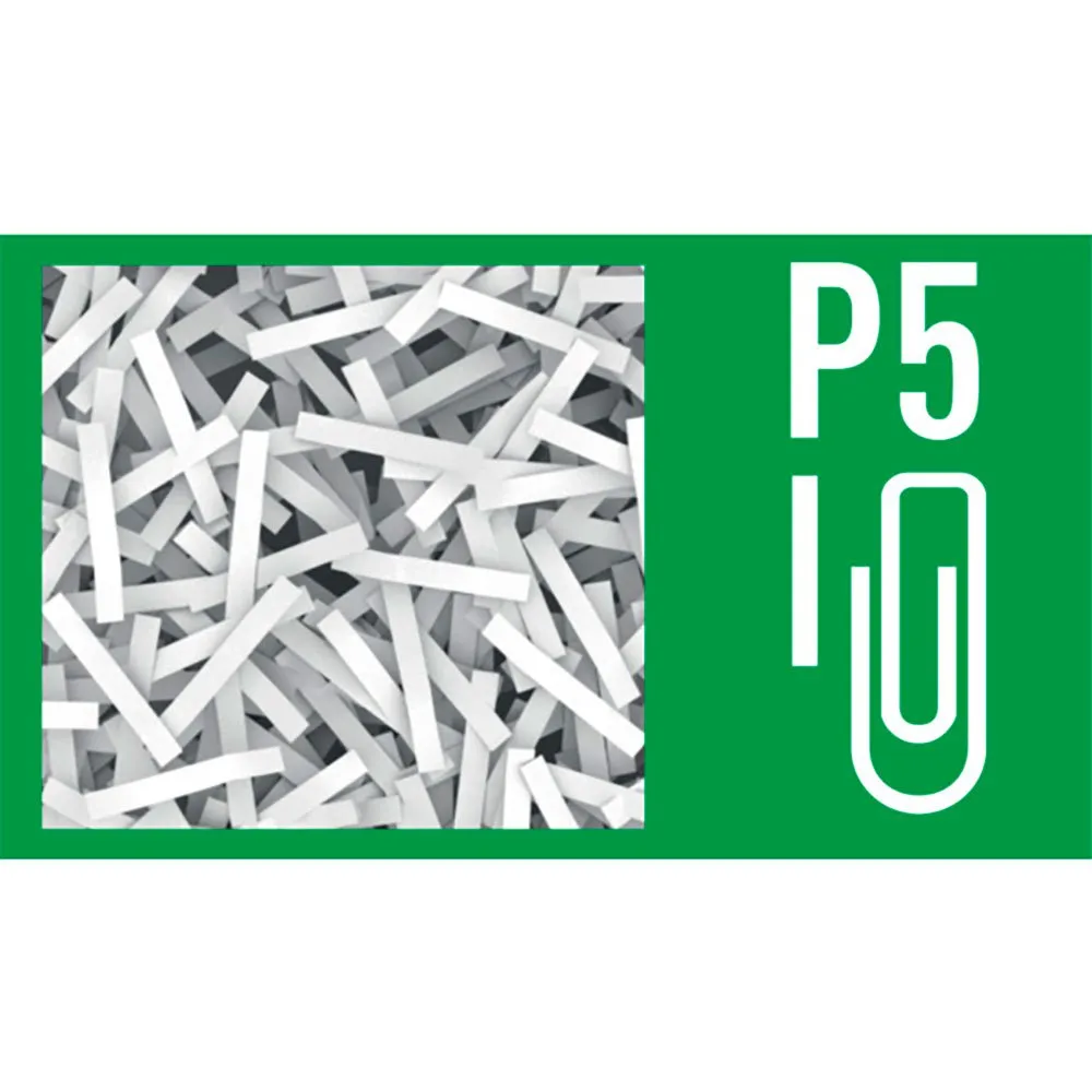 Automatically shreds 150 A4 sheets into P5 security level micro particles (2x15mm) in one go in the generous 44 liter bin.