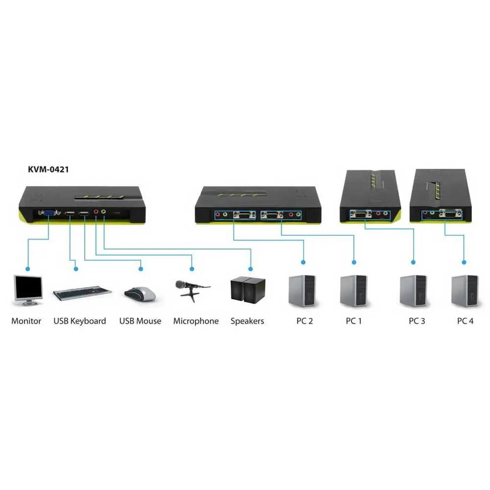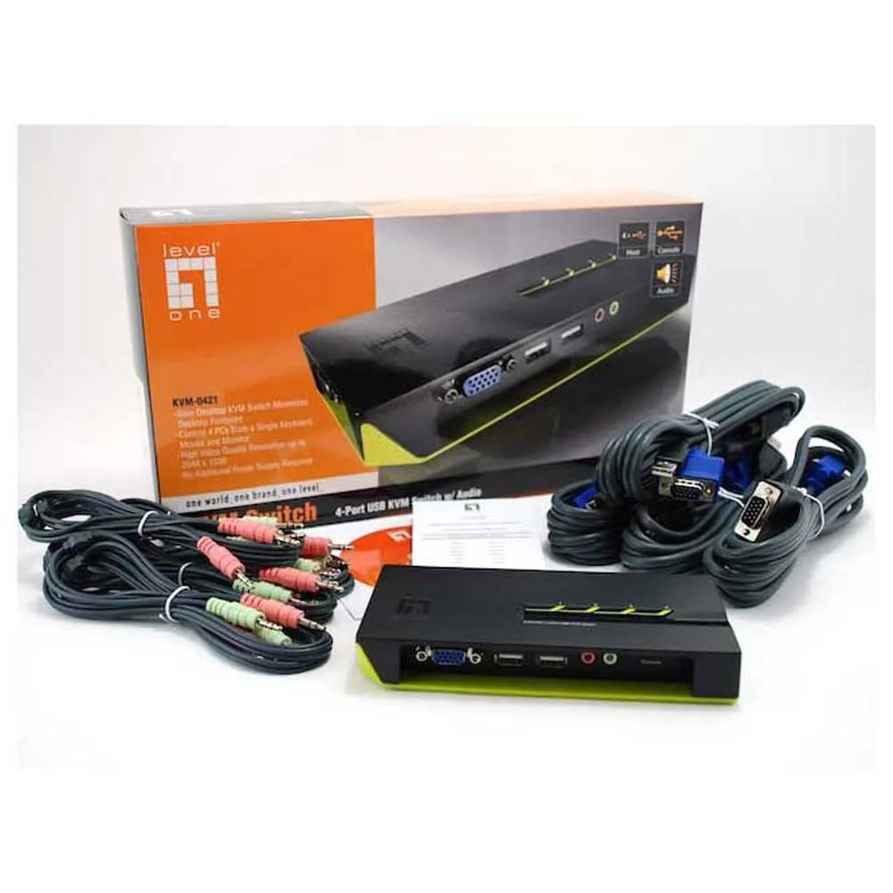 - The LevelOne KVM-0421 connects four computer systems to a single USB keyboard, USB mouse and monitor. The 4-Port USB KVM Switch also provides audio support allowing users to connect the audio ports of each computer to the KVM switch.