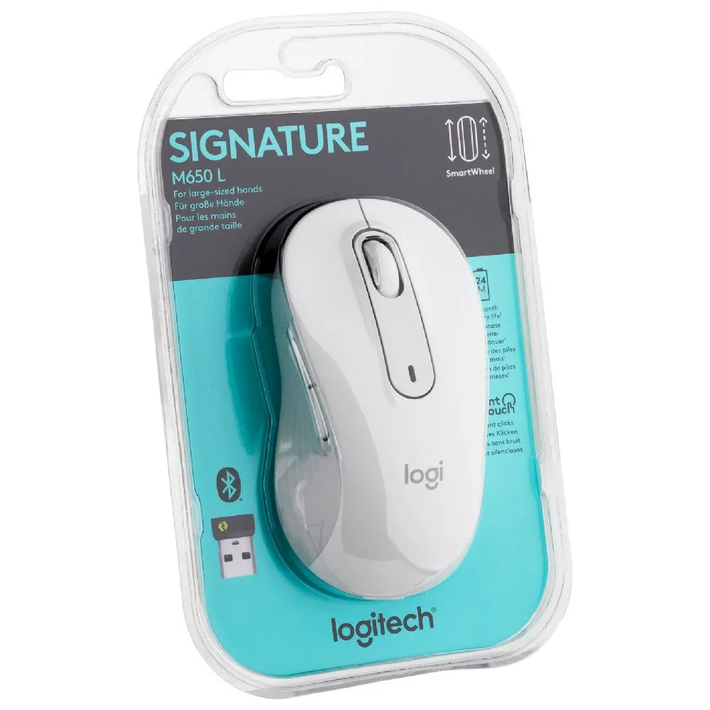 Boost your workflow with the Logitech M650L wireless mouse, crafted for larger hands. Its innovative SmartWheel delivers both precise, line-by-line control and super-fast scrolling through long documents. The contoured shape and soft rubber grips ensure all-day comfort. Work without distraction thanks to SilentTouch technology, which eliminates 90% of click noise. Customize the side buttons for your favorite shortcuts, connect via Bluetooth or the Logi Bolt USB receiver, and enjoy up to two years of battery life. This is smarter scrolling, better comfort, and more productivity