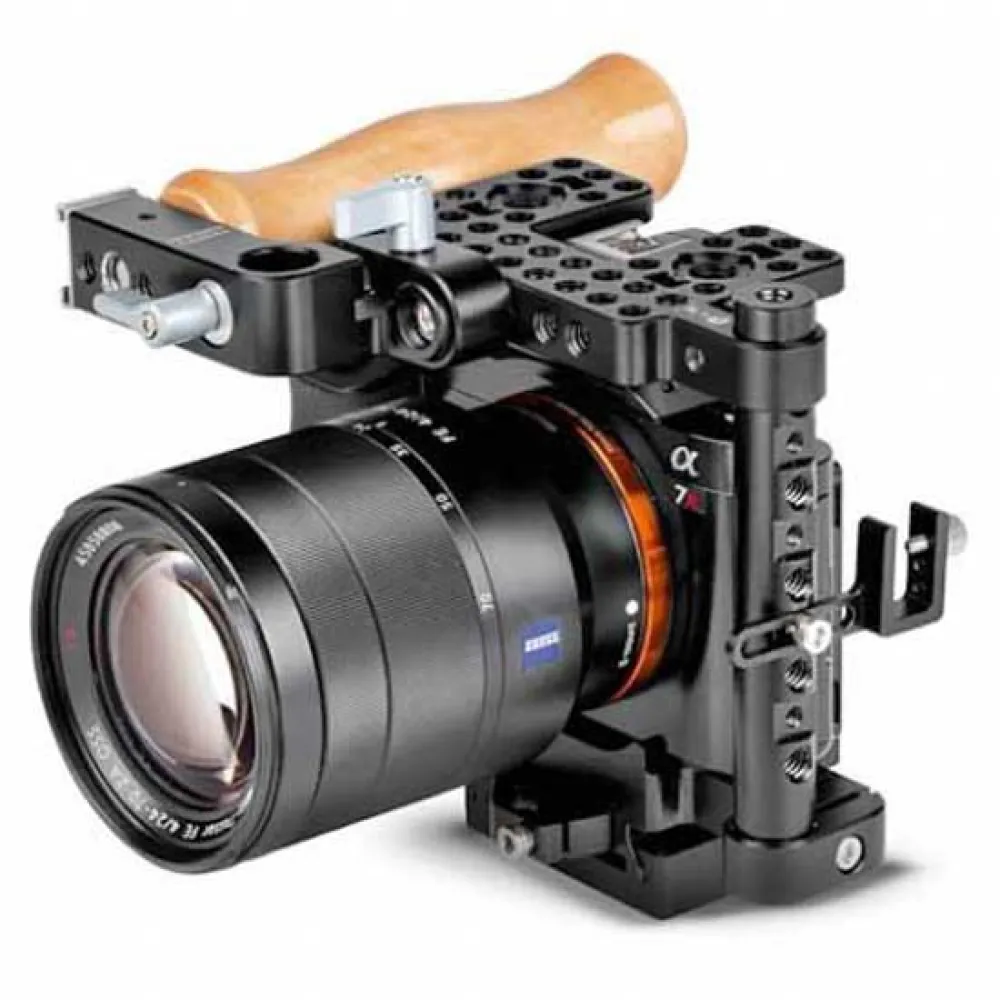Camera Cage Small is designed for the Sony A7 series and Panasonic GH5 cameras, which utilize a top-mounted XLR audio module for sound recording. The minimalist design and the lightweight structure gives several mounting points for your accessories on the top and side including two anti-rotation attachment compatible with Manfrotto 244MICRO-AR and Arri standard mounting points. The cage includes a reversible top handle which can be repositioned over the lens area when an XLR adapter is in use. The handle can also fold down when packing your bag and can even be reconfigured onto the left, vertical 15mm rod for a secondary grip. Built into the handle is a cold shoe mount and a 15mm tube clamp for mounting any of Wooden Camera UVF Mount kits used with 3rd party electronic viewfinders. Cameras with fold-out LCD screens can be positioned easily and an included HDMI cable clamp can be mounted to the vertical rod to secure video cables and prevent port damage.