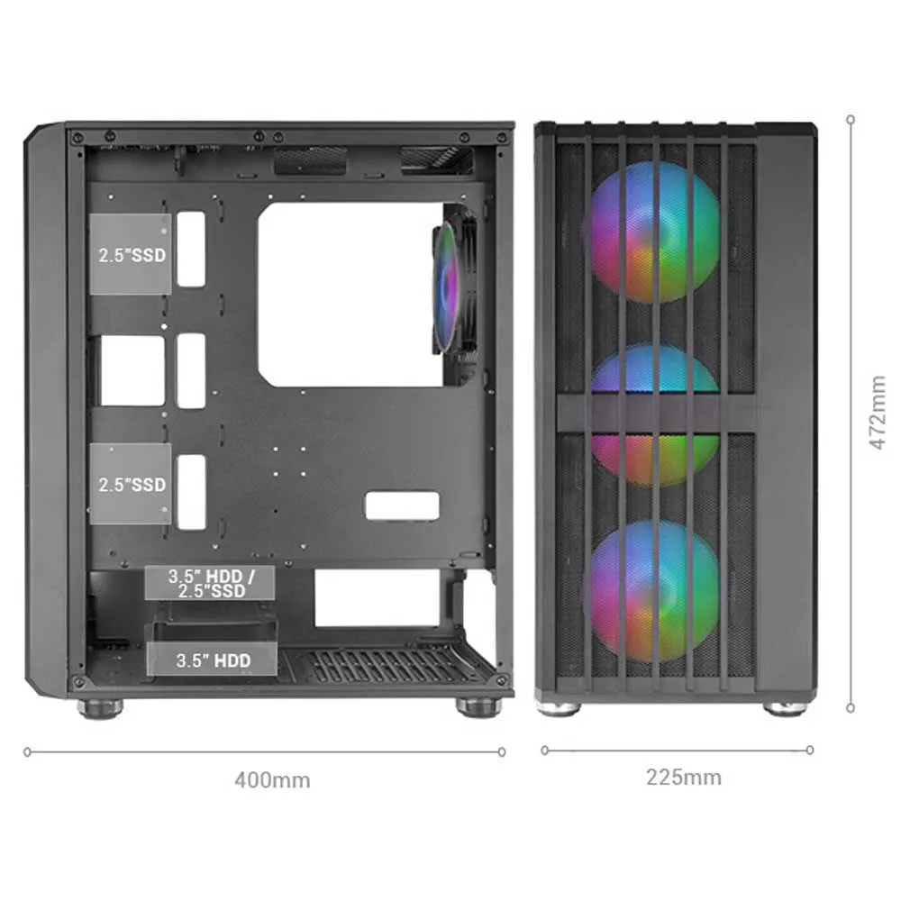 The MC-VAULT combines power and design in an ATX mid-tower that stands out for its impressive Mesh front with vertical grille and 4 pre-installed 120mm ARGB fans. It offers optimal airflow and RGB lighting that will transform your setup into a visual spectacle. The tempered glass side window shows off your configuration in all its splendor. The ARGB lighting of the fans stands out perfectly through the glass, adding a modern and professional touch to your setup.