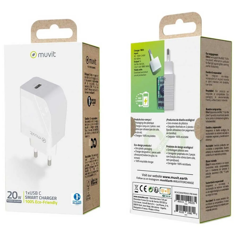 It has 1 Type C PD 20W port to provide faster charging and is compatible with smartphones and tablets with a Type C port (cable not included).Our new muvit for change cargo range has been designed to facilitate end-of-life recycling, and we are committed to donating 1% of the proceeds to the planet.