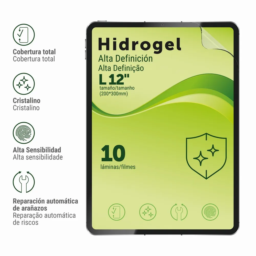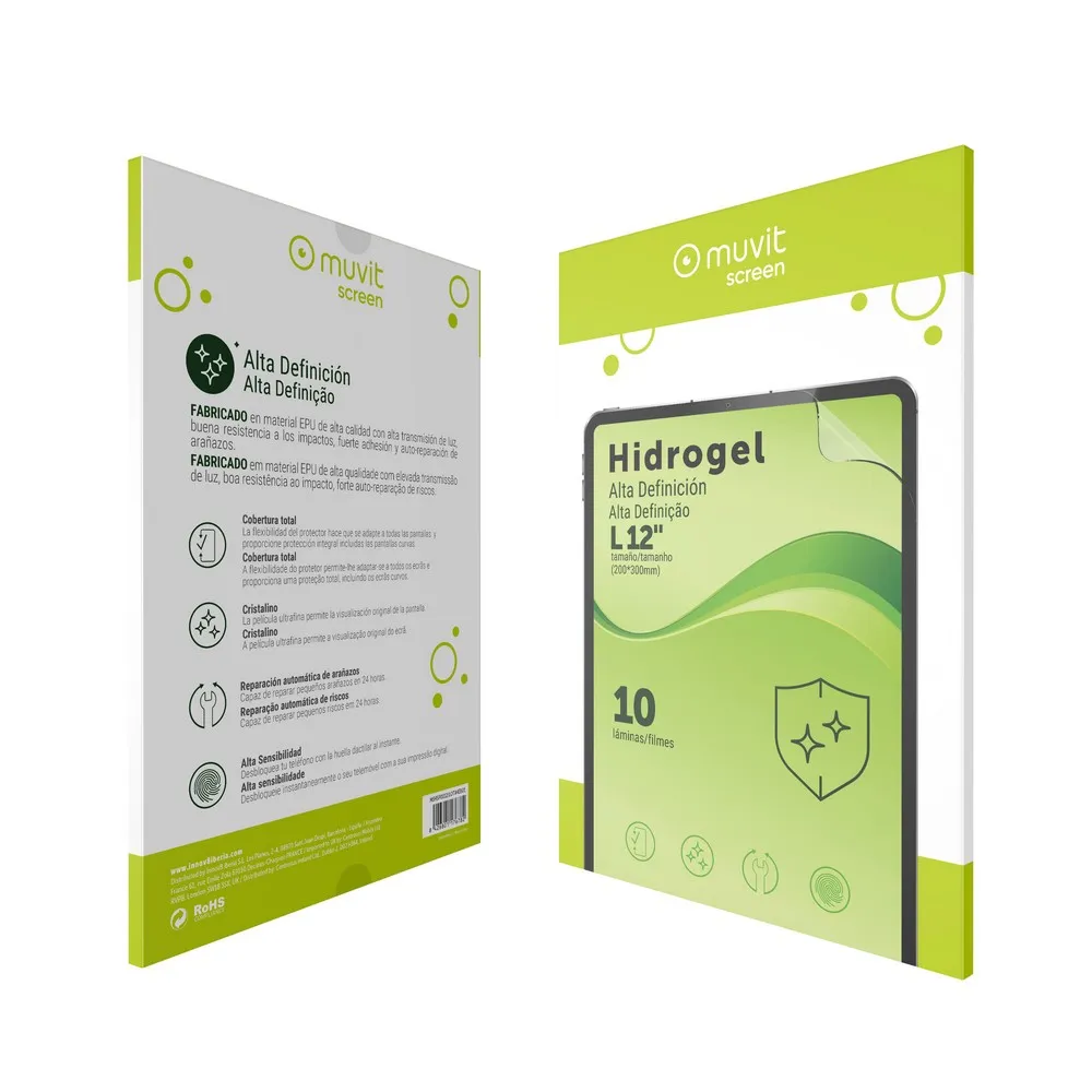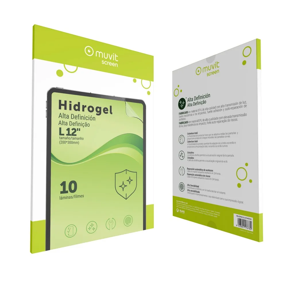 Protect your tablet with the muvit screen High-Definition Hydrogel Screen Protector in size L for 12´´ tablets (200x300mm), made from high-quality EPU material with excellent light transmission, impact resistance, strong adhesion, and scratch self-repair, offering full coverage that adapts to all screens including curved edges, the ultra-thin crystal-clear film preserves the original display clarity while maintaining high sensitivity for instant fingerprint unlocking, small scratches repair automatically within 24 hours, providing reliable protection without compromising touch experience, the flexible design ensures complete screen protection while keeping the tablet responsive and smooth to use, enjoy a durable, self-healing screen protector that safeguards your device from daily wear and tear with muvit screen High-Definition Hydrogel.