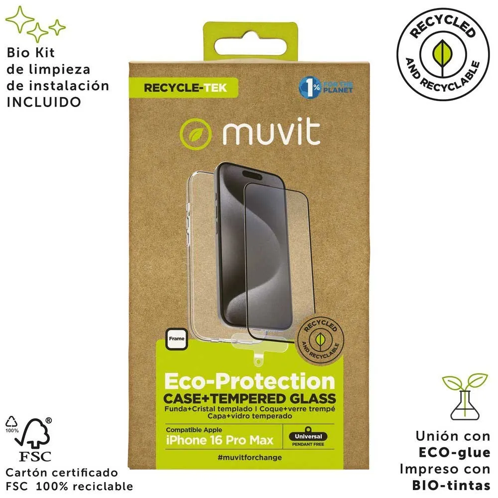 Protect your iPhone 16 Pro Max and the planet with the muvit for change pack featuring a Recycletek case and a flat tempered glass screen protector with black frame the case is made from 100% recycled materials and is 100% recyclable soft and flexible to the touch protecting against scratches bumps and small drops with full access to all ports camera speakers and buttons the tempered glass offers 9H hardness ultra-thin 0.3mm thickness oleophobic coating repelling water grease and dirt high touch sensitivity scratch and break protection anti-reflective and anti-fingerprint easy to apply with biodegradable PLA film and bag and includes a BIO cleaning kit all packaging is eco-friendly FSC certified 100% recycled and recyclable with BIO inks and eco-glue at muvit for change we believe every small choice matters our accessories are made mainly from certified recycled plastic providing a conscious choice for those looking to reduce their environmental footprint from cases to solar chargers each item reflects our commitment to sustainability join the environmental commitment and protect your device while caring for the planet compatible with Apple iPhone 16 Pro Max product type mobile case protection group.
