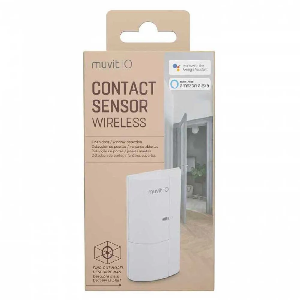 Contact sensor for doors and windows for security system muvit iO. This consists of two parts which allows detection of opening doors and windows. Compatible with Google and Amazon Alexa Assistant.