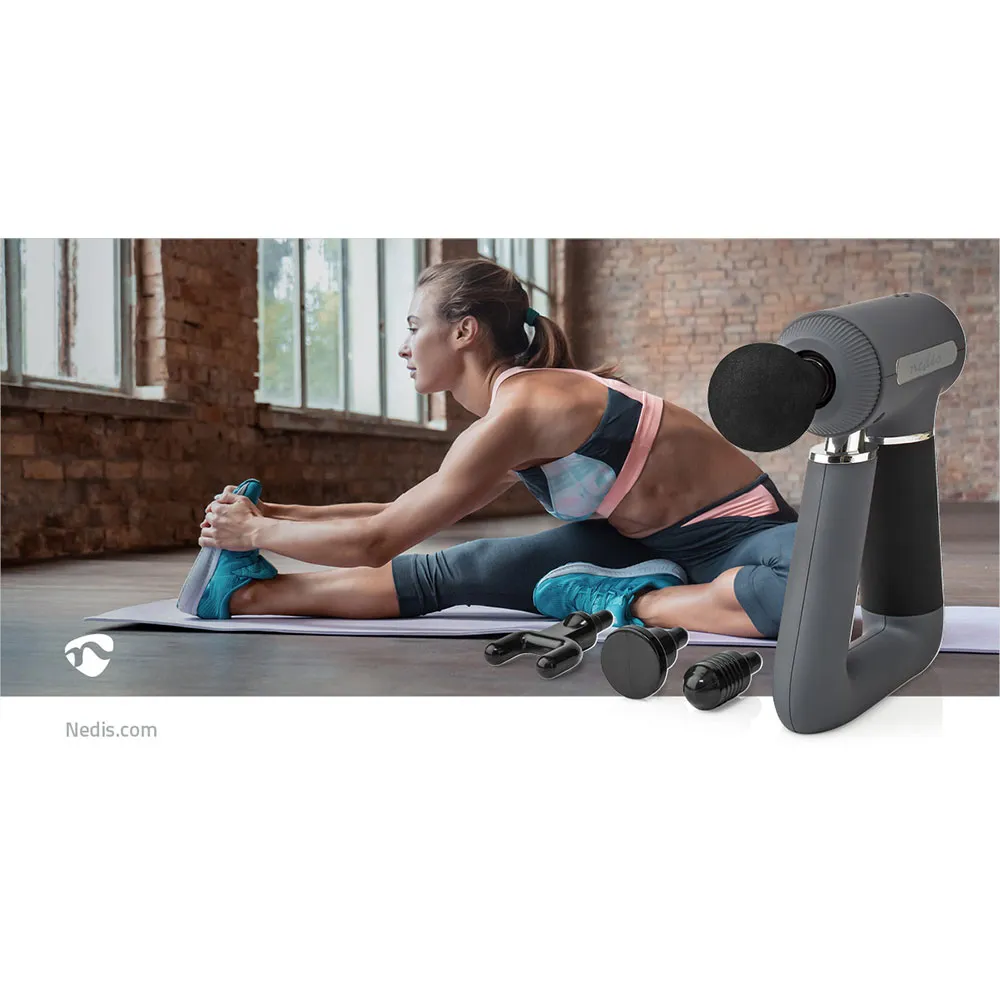 The Nedis Sport Massage Gun is ideal for warming up the muscles before your workout, or to reduce pain and tension in your body afterwards. The massage gun stimulates blood circulation and helps to speed up muscle recovery. The device is also ideal for general relaxation and stress reduction in body and mind. The special, triangular handle allows you to easily reach hard-to-reach places, like your back and shoulders. The massage gun has a powerful brushless motor with a high torque and six different speeds, making the massage gun ideal for both sensitive and less sensitive areas on the body. It comes with 4 interchangeable massage head attachments with which you can massage the different body parts and muscle groups. The massage gun is silent and equipped with a powerful rechargeable lithium battery. Thanks to the intelligent safety protection, the gun switches off automatically after 10 minutes of use.