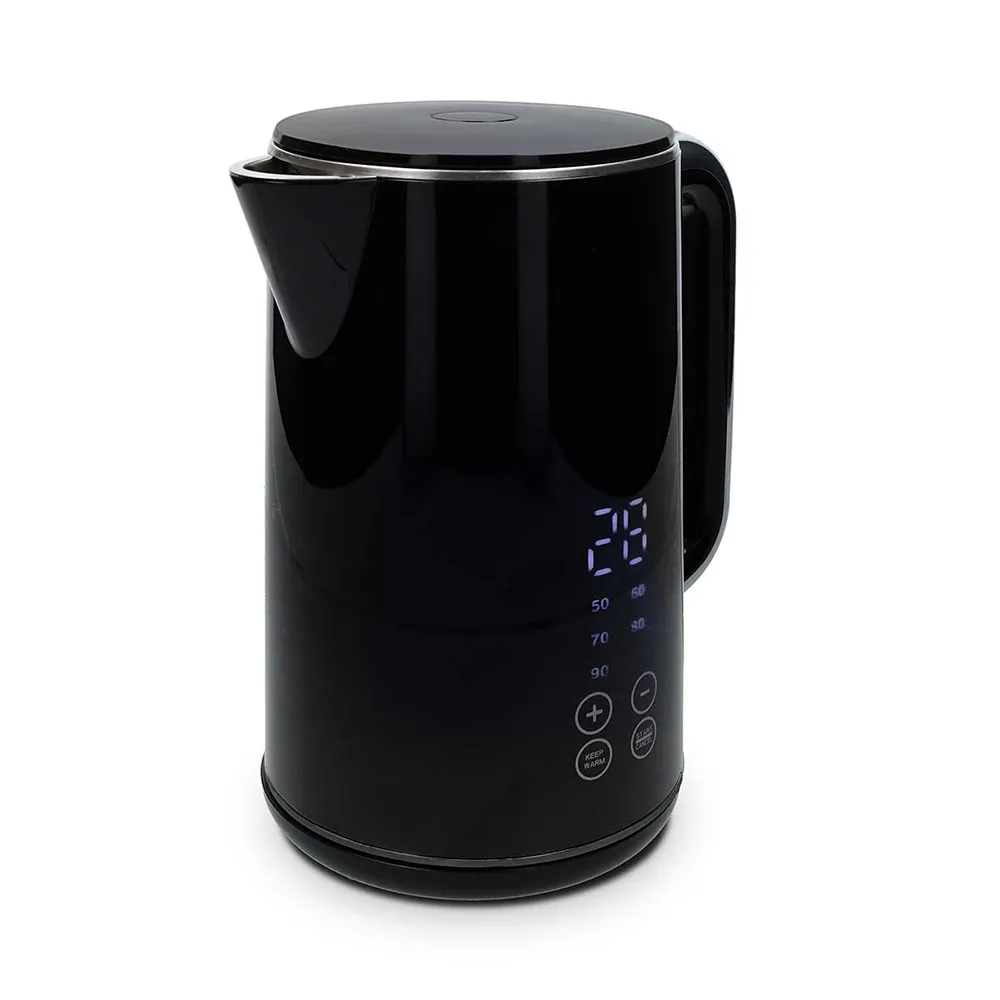 Elegant black kettle with a volume of 1.7 liters and a digital display on the housing.