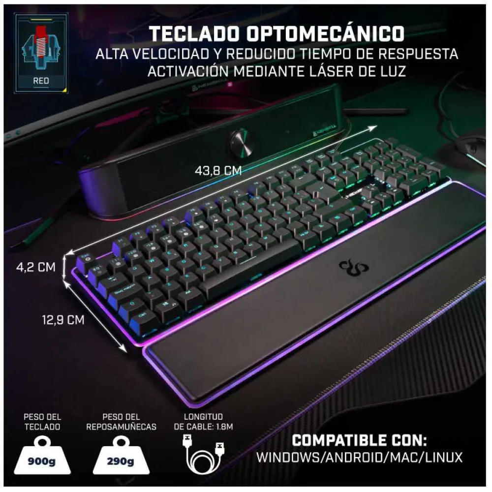 Gungnyr Pro is Newskill´s full layout optomechanical keyboard, with an aluminum body and fast Gateron Red switches. Its lighting is customizable through software, both on the keyboard and on its magnetic wrist rest, which in combination will give the best gamer atmosphere to your play area. You will be able to change the switches to your liking, thanks to their compatibility with hot-swap, and choose from the range of Gateron switches the ones that best suit you. Gungnyr Pro, a single keyboard for everything you want.
