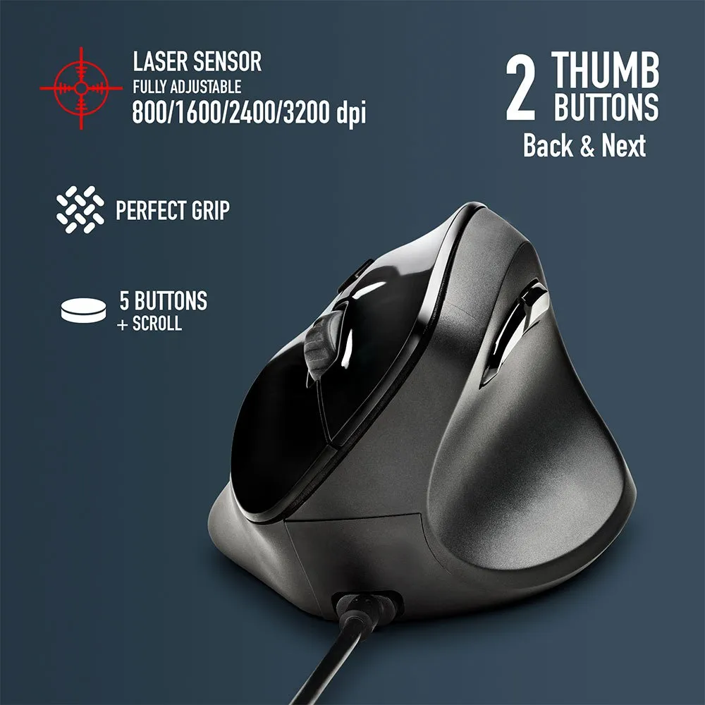 - This vertical mouse features 5 buttons and a scroll wheel.