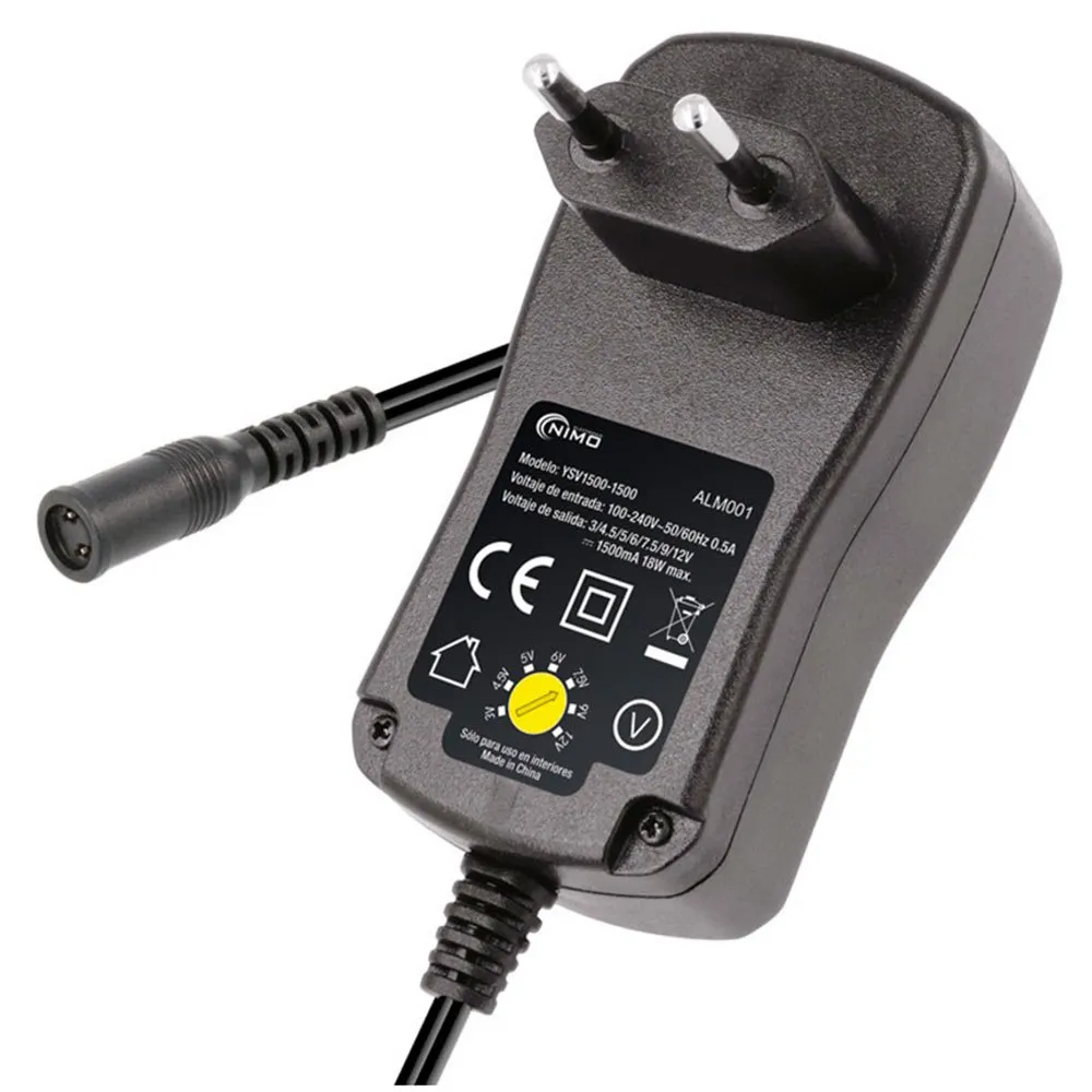 Electronic Power Supply 12v.1500 Mah 18w With Adjustable Selector 3.0v / 4.5v / 5.0v / 6.0v / 7.5v / 9.0v / 12.0v With 6 Interchangeable Plugs 3.50x1.35mm, 5.00x2, 10mm, 5.50x2.50mm, 2.35x0.70mm, 4.00x1.70mm, 2.5mm Mono Jack.