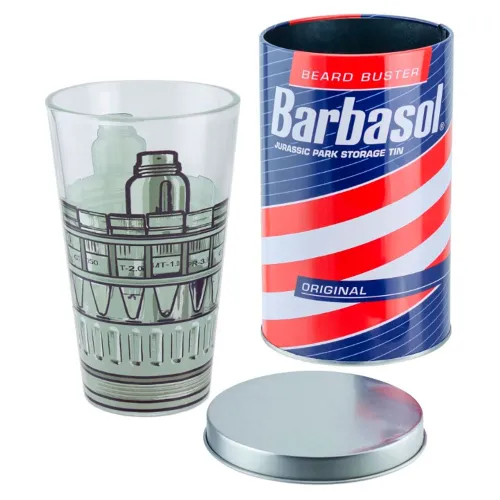 The main feature of this set is its incredible attention to detail. The drinking glass proudly displays the classic red, white, and blue branding of the Barbasol can, instantly recognizable and authentically recreated. The accompanying storage tin mirrors this design, creating a cohesive and visually striking collectible. Whether you choose to showcase it on a shelf in your fan zone, use it as a unique desk organizer, or simply enjoy a drink from the glass, this set is designed to integrate seamlessly into your collection of movie memorabilia. It’s a clever and subtle nod to the franchise that discerning fans will deeply appreciate, elevating your collection from ordinary to extraordinary. Secure this precious cargo for your own collection and ensure this piece of history doesn´t go extinct.