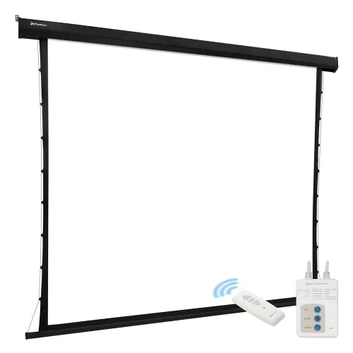 The motorized tensioned screen features a durable, quiet electric motor and includes a remote control It can be stopped in the desired position, making it possible to place it in 16:9 panoramic, 4:3 rectangular and 1:1 square vision.