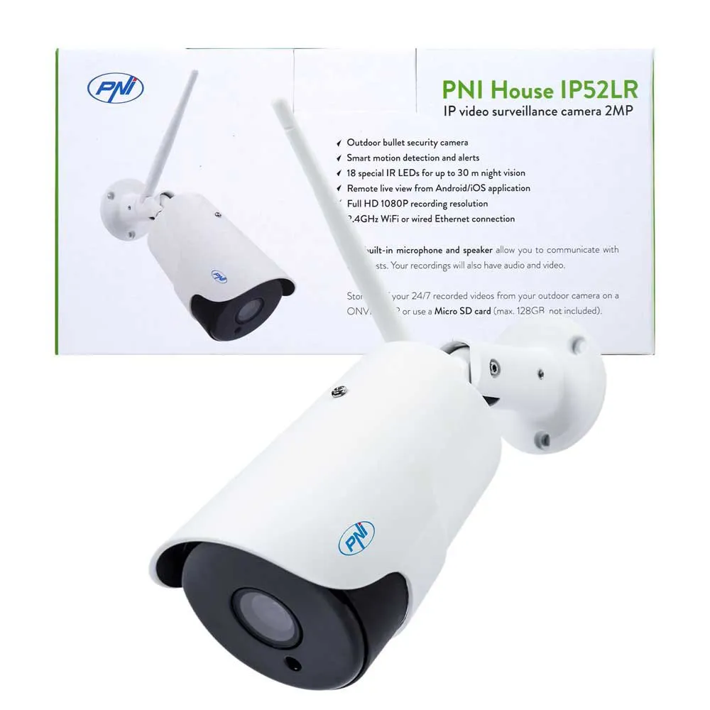 - The IP52LR video surveillance camera can save recordings locally to a micro SD card with a maximum capacity of 128GB (card not included). Connected to a compatible NVR (eg PNI IP7516 / IP716LR) the recordings can be saved to a higher capacity hard disk. In case of installing in the room a micro SD card with reduced capacity, we recommend activating the recording only at motion detection.